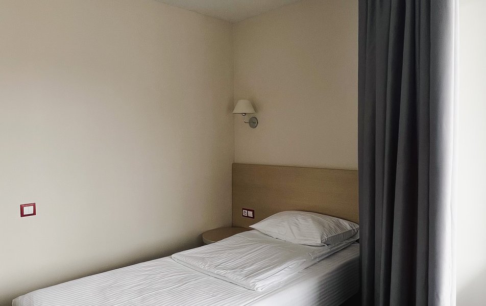 Оснащение номера: вешалка, зеркало, кровать односпальная, прикроватная тумбочка, стол, стул, шкаф, набор посуды, сплит-система, телевизор, телефон, холодильник