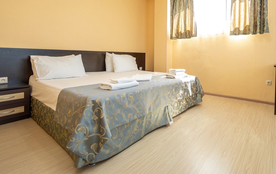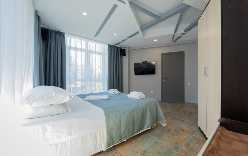 Оснащение номера: диван раскладной, кровать двуспальная, прикроватные тумбочки, стол, стулья, шкаф, мини-кухня не для приготовления пищи, кондиционер, сейф, телевизор ЖК, холодильник