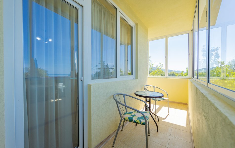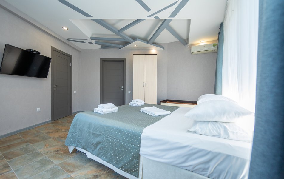 Оснащение номера диван раскладной: 2, кровать двуспальная, прикроватные тумбочки, стол, стулья, шкаф, мини-кухня не для приготовления пищи, кондиционер, сейф, телевизор, холодильник