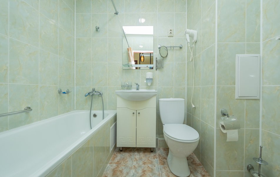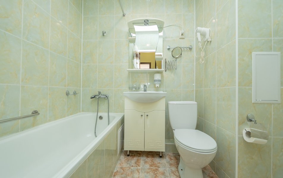 Сан.узел: ванна, раковина, унитаз, биде, тапочки, туалетные принадлежности, фен