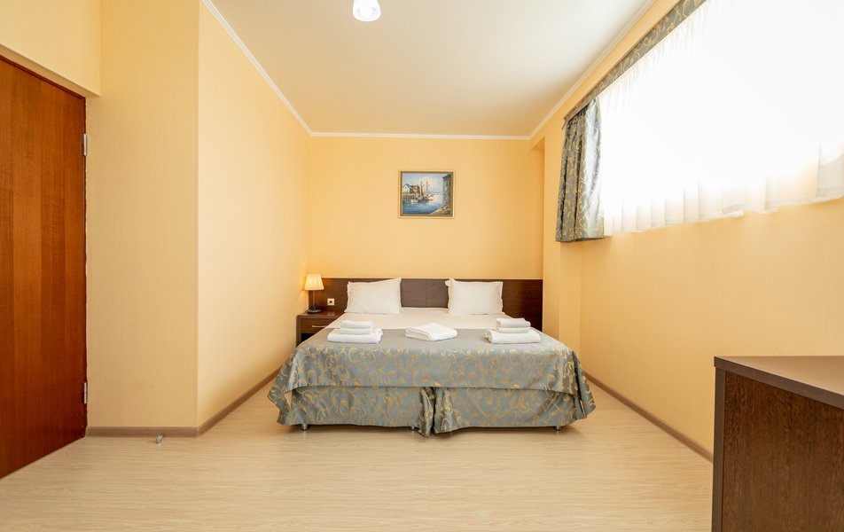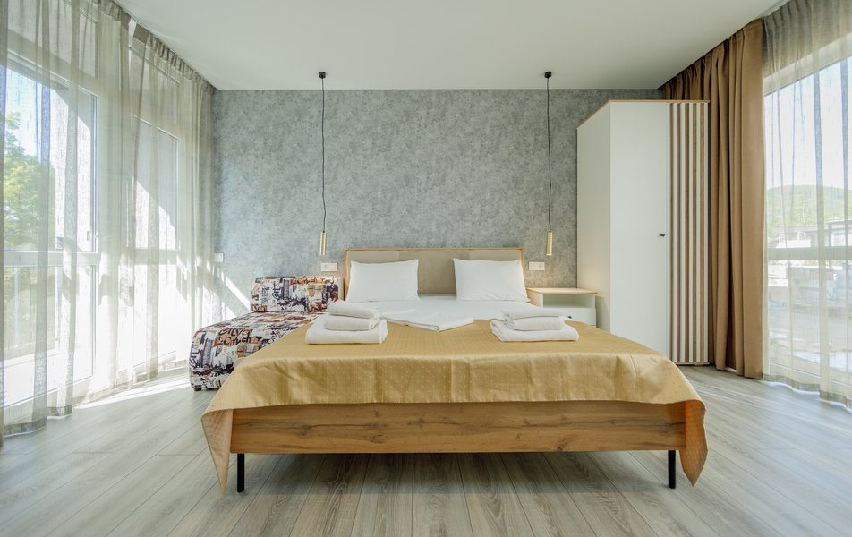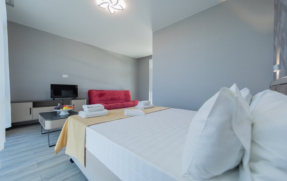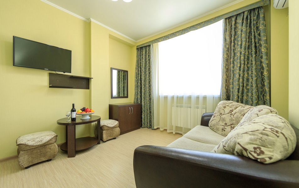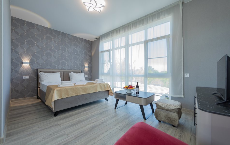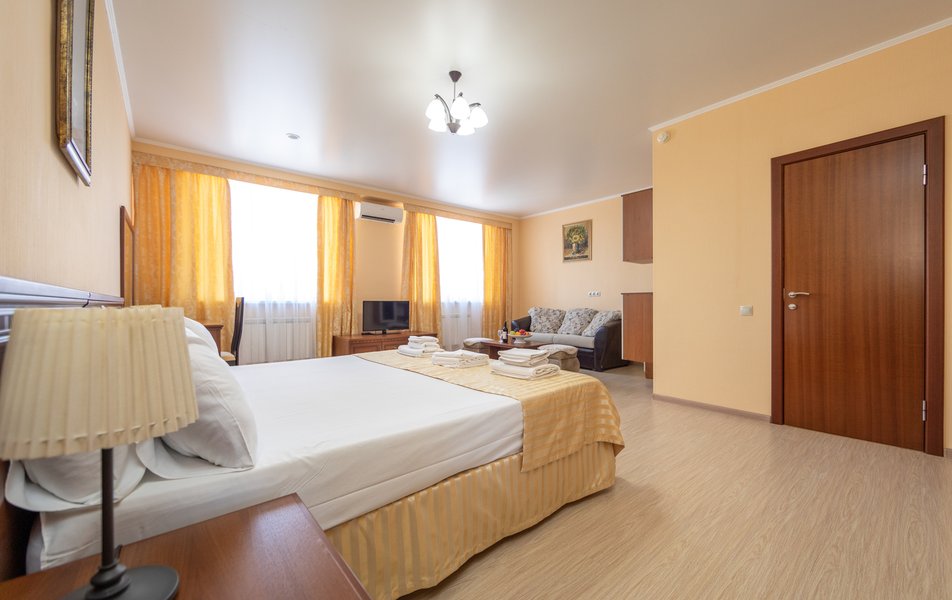 Оснащение номера: диван раскладной, кровать двуспальная, прикроватные тумбочки, стол, стулья, шкаф, кондиционер, сейф, телевизор ЖК, холодильник