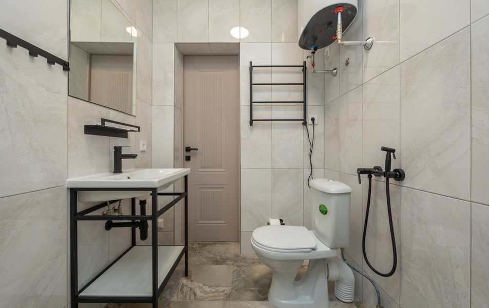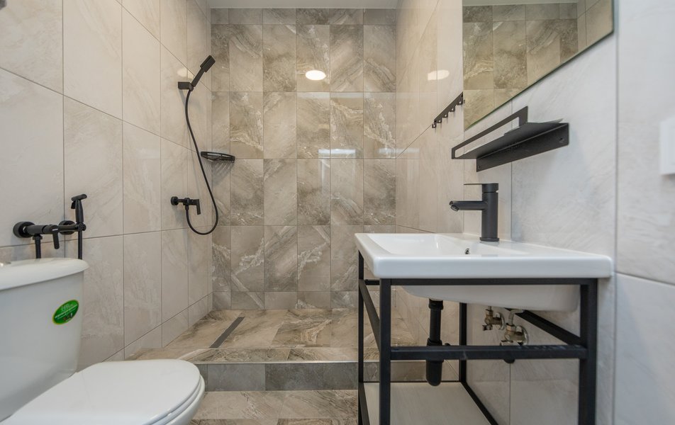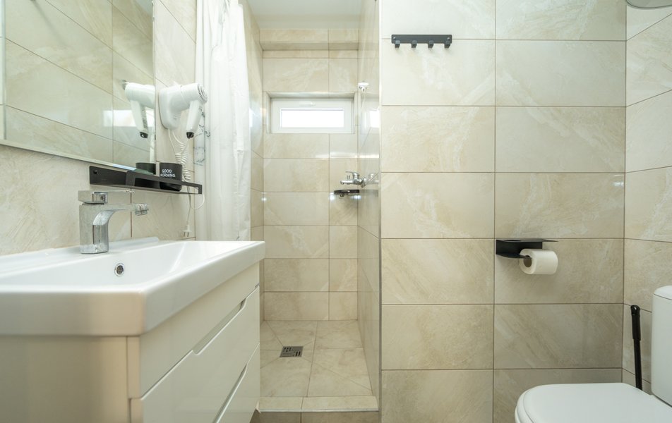 Сан.узел: душ, раковина, унитаз, туалетные принадлежности, фен, тапочки