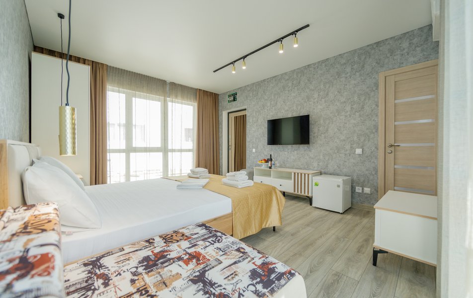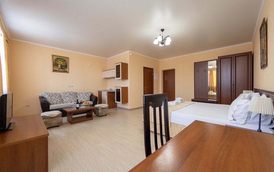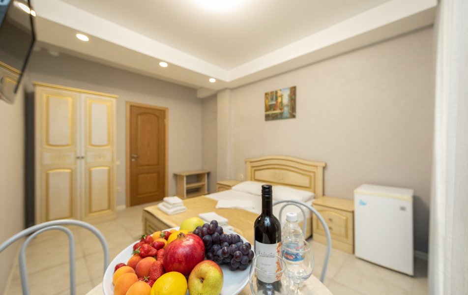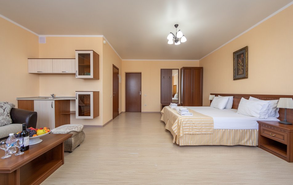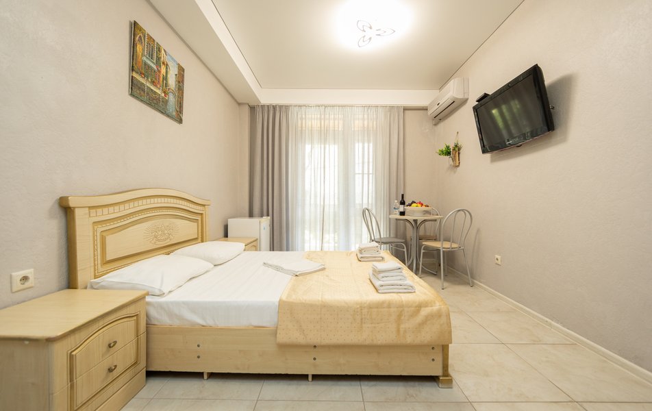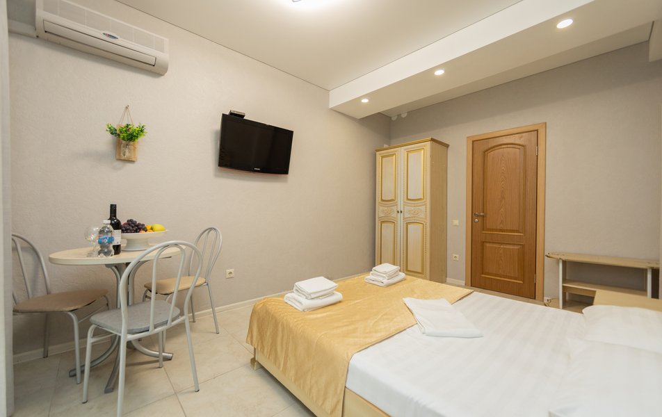 Оснащение номера: кровать двуспальная, прикроватные тумбочки, стол, стулья, шкаф, мини-кухня не для приготовления пищи, кондиционер, сейф, телевизор ЖК, холодильник