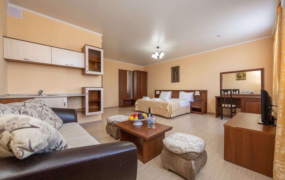 Оснащение номера: кровать двуспальная, прикроватные тумбочки, диван, мини-кухня, стол, стулья, шкаф, кондиционер, сейф, телевизор, холодильник