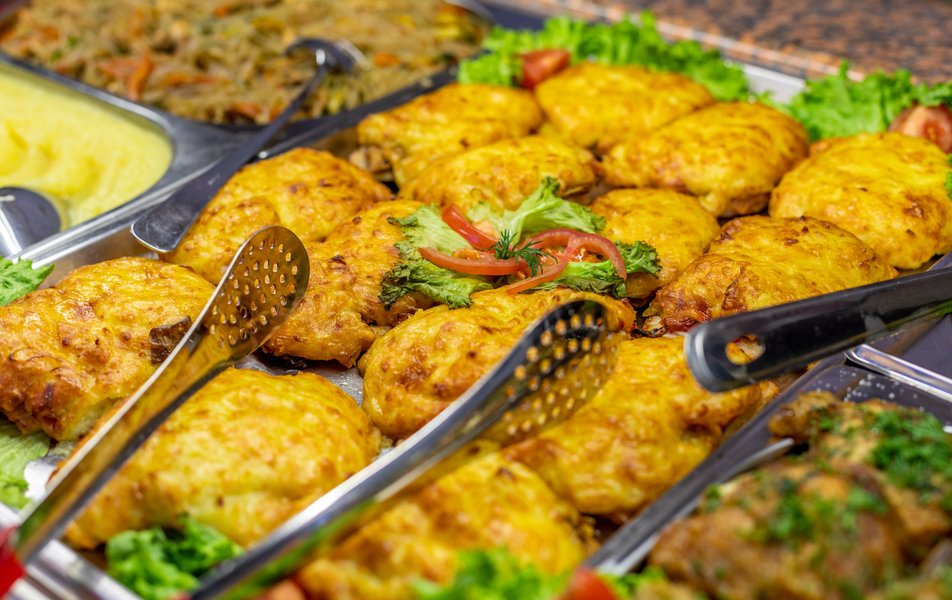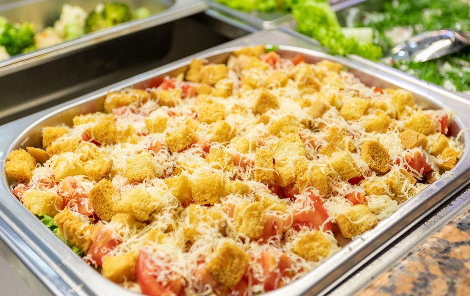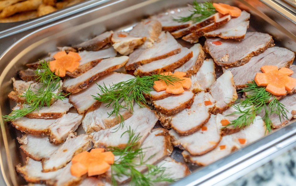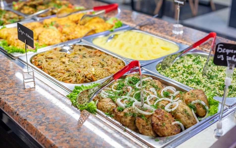 - Обед (13:00–15:00): первые блюда, мясные и рыбные горячие блюда, салаты, гарниры, десерты