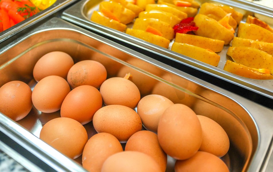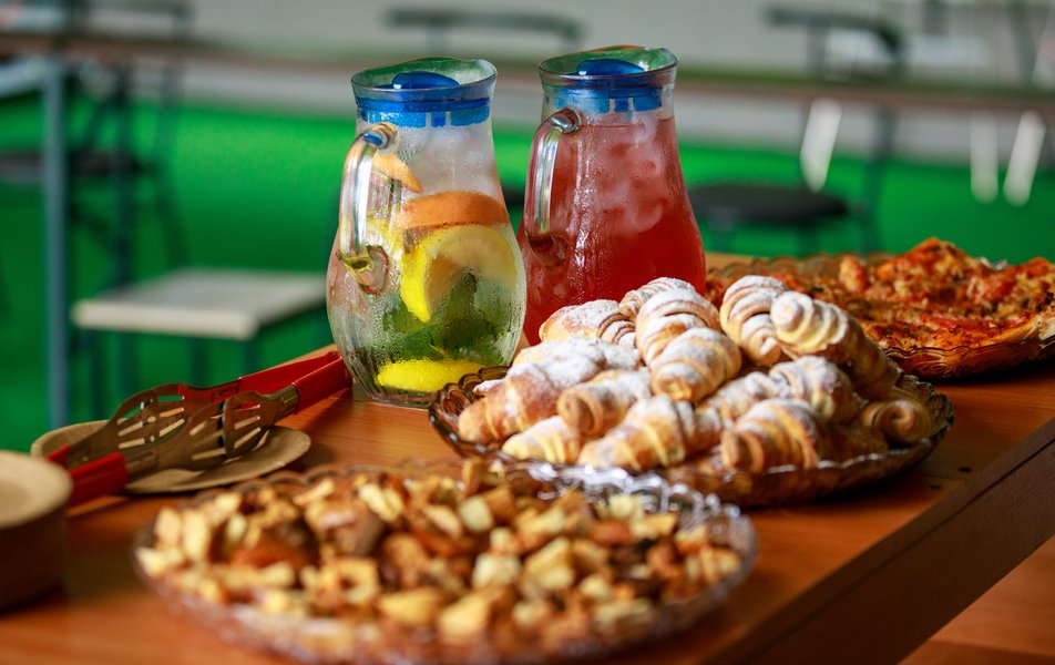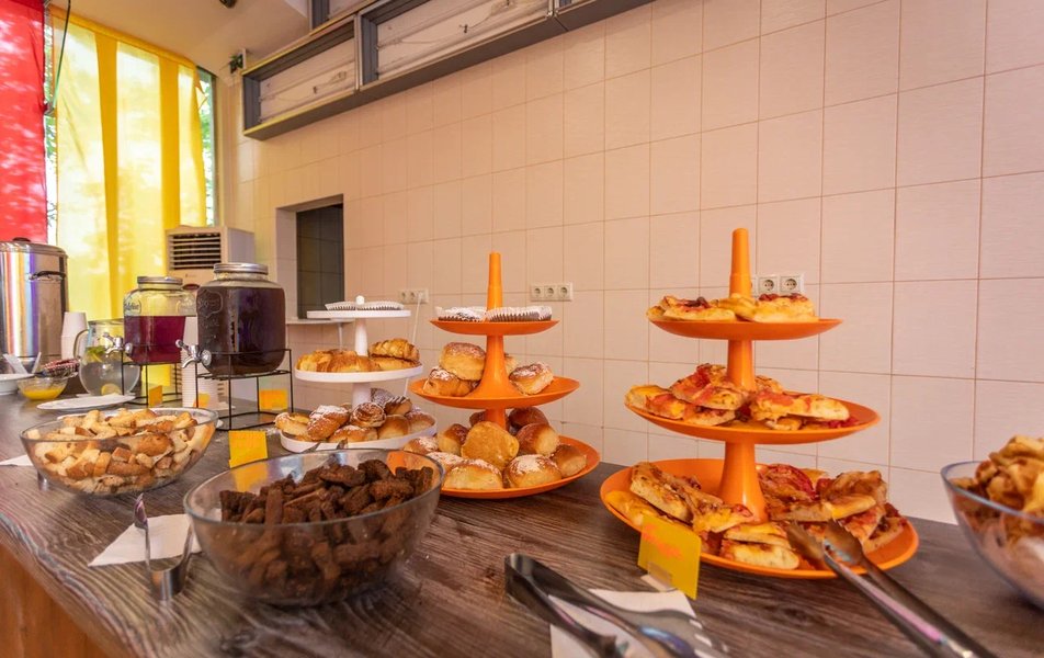 - Завтрак (08:00–10:30): яйца в разных вариантах, бекон, сосиски, каши, свежие овощи и фрукты, йогурты, выпечка собственного производства