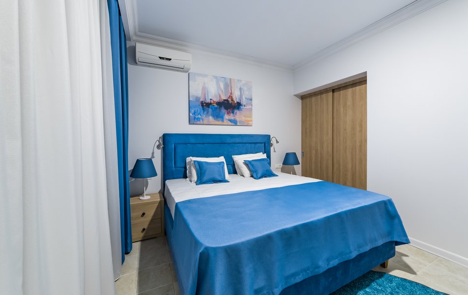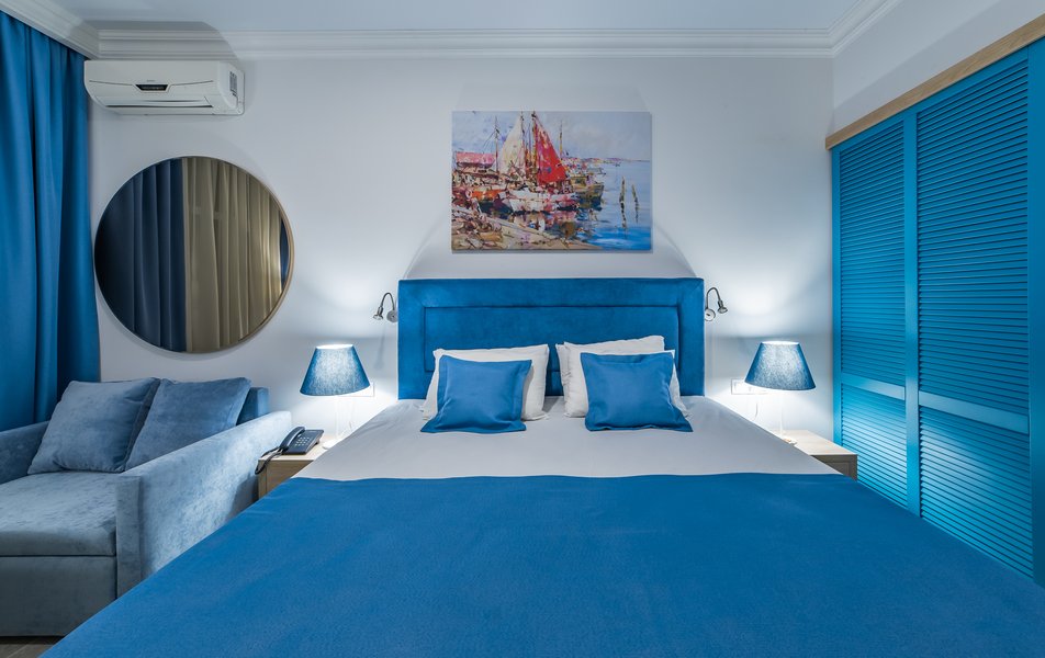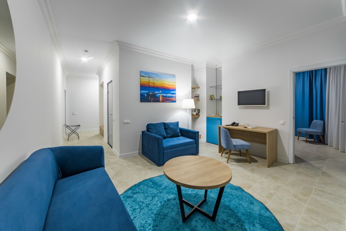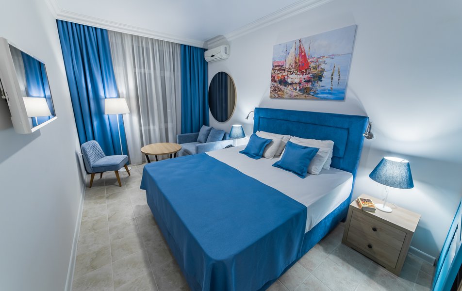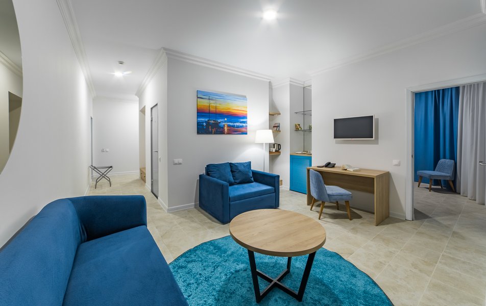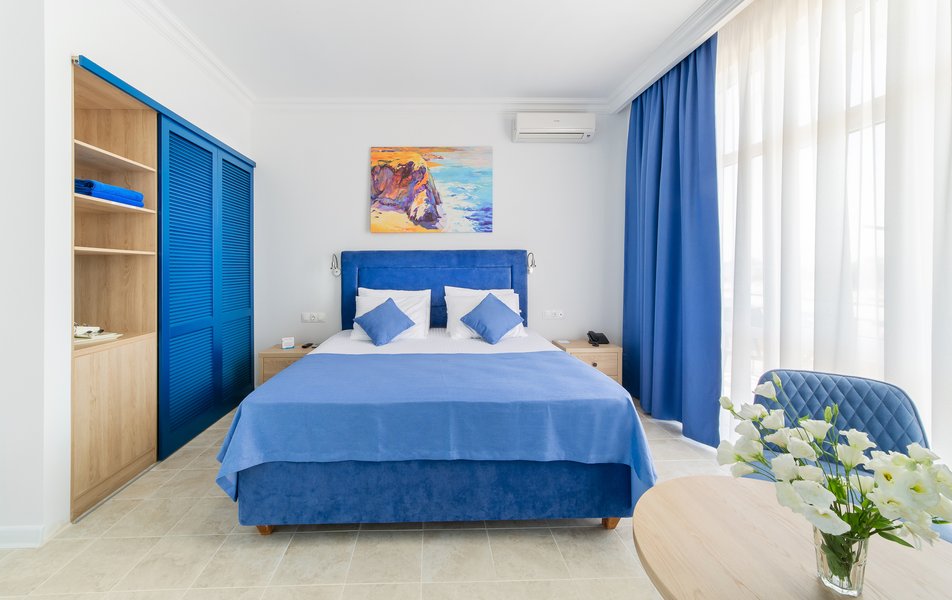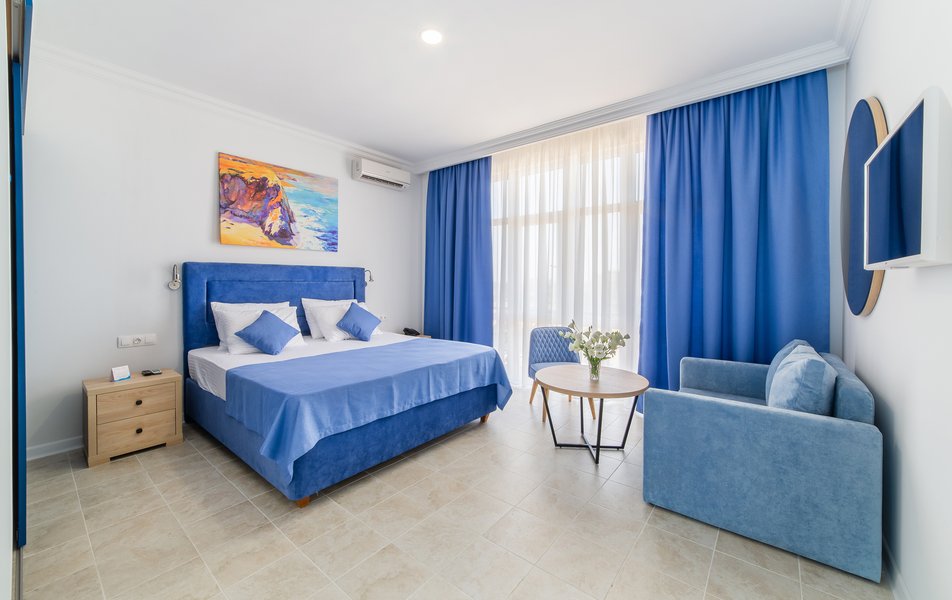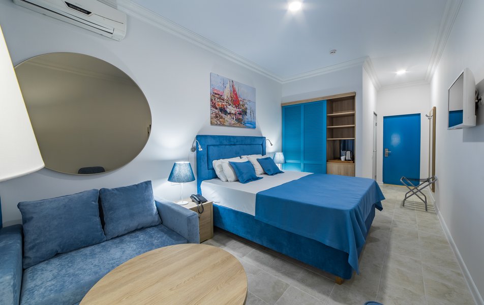 В номере:вешалка, диван, кровать двуспальная, прикроватные тумбочки, стол, стул, шкаф, пляжные полотенца, сейф, система общего кондиционирования, телевизор ЖК, холодильник