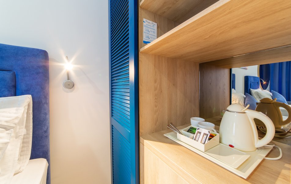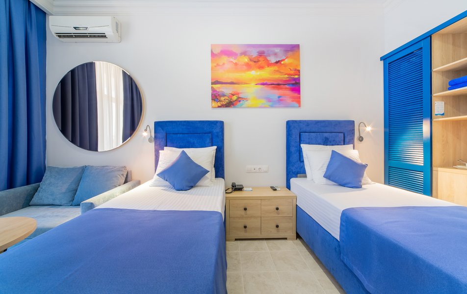 В номере: вешалка, диван, зеркало, кровати односпальные, прикроватные тумбочки, стол, стулья, шкаф, пляжные полотенца, сейф, система общего кондиционирования, телевизор ЖК, телефон, холодильник