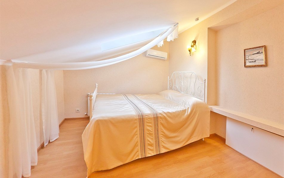 Оснащение номера: диван раскладной, зеркало, кровать двуспальная, прикроватные тумбочки, стол, стул, шкаф, пляжные полотенца, сейф, сплит-система, телевизор ЖК, холодильник