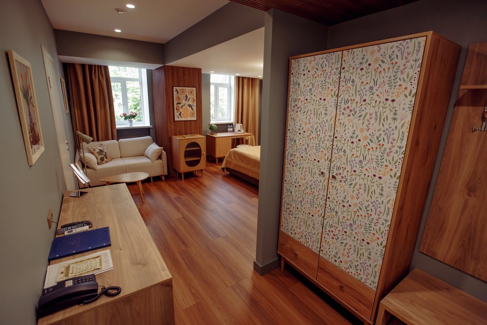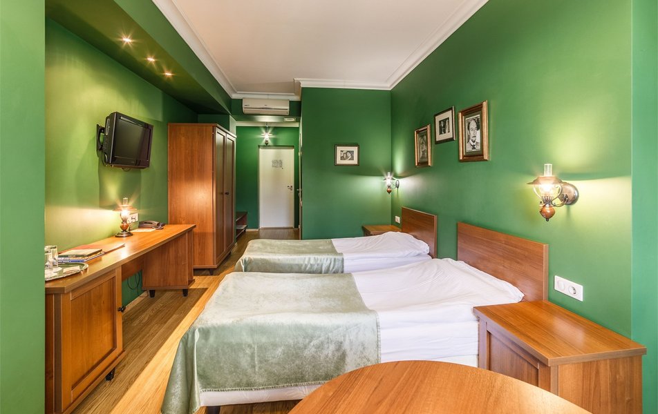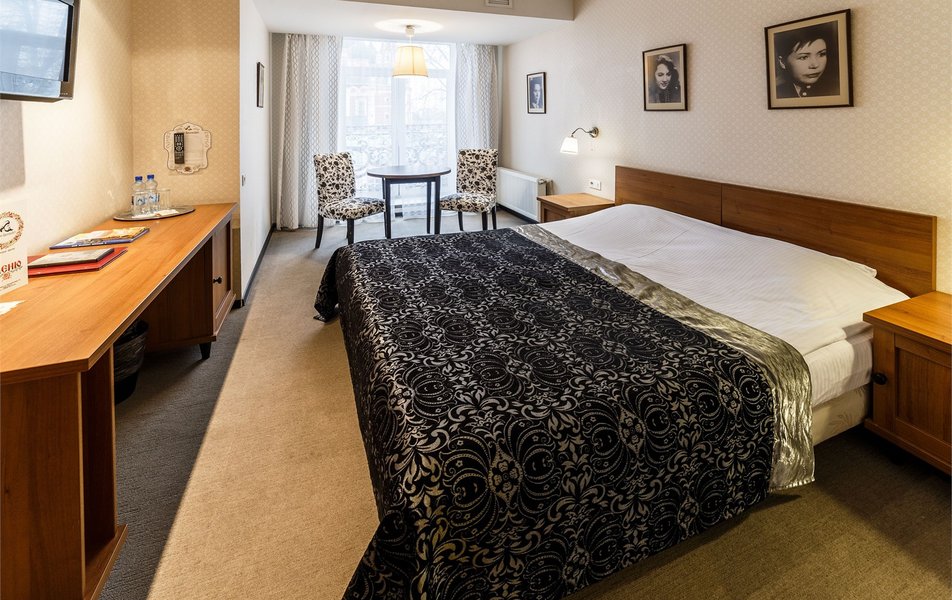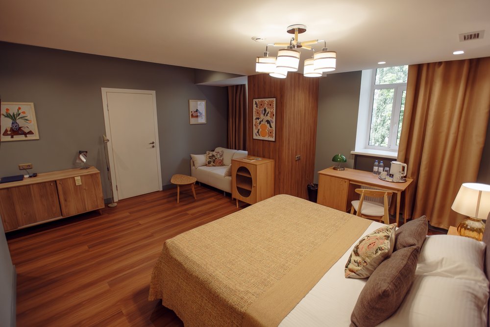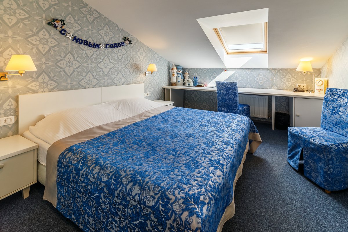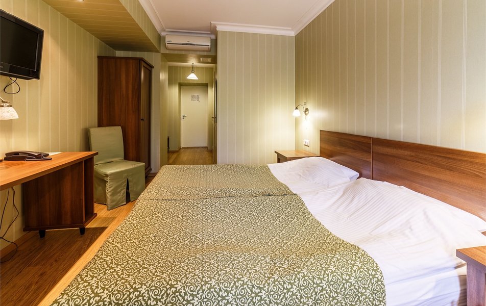 Оснащение номера: вешалка, зеркало, кровать двуспальная или две односпальные (сдвигаются), прикроватные тумбочки, стол, стулья, шкаф, кондиционер, мини-холодильник, телевизор, телефон, чайная станция