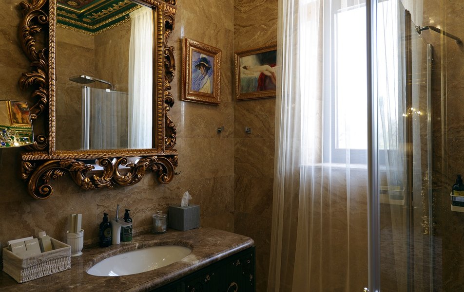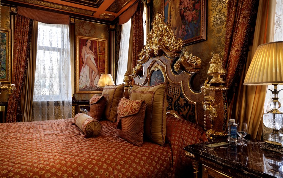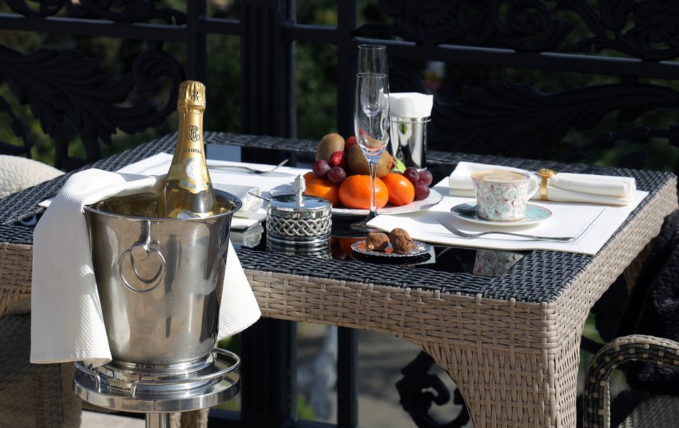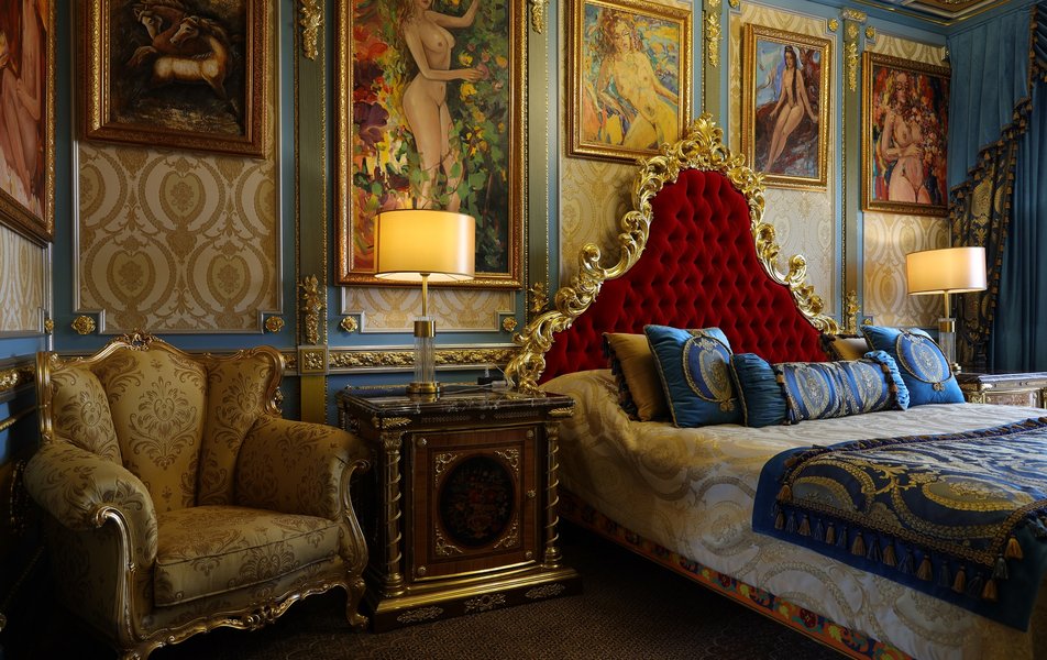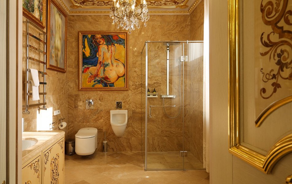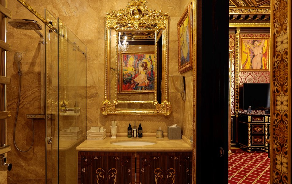 Оснащение номера: вешалка, гардеробная, кресло, зеркало, кровать двуспальная, набор мягкой мебели, прикроватные тумбочки, кондиционер, кофемашина, сейф, телевизор ЖК
