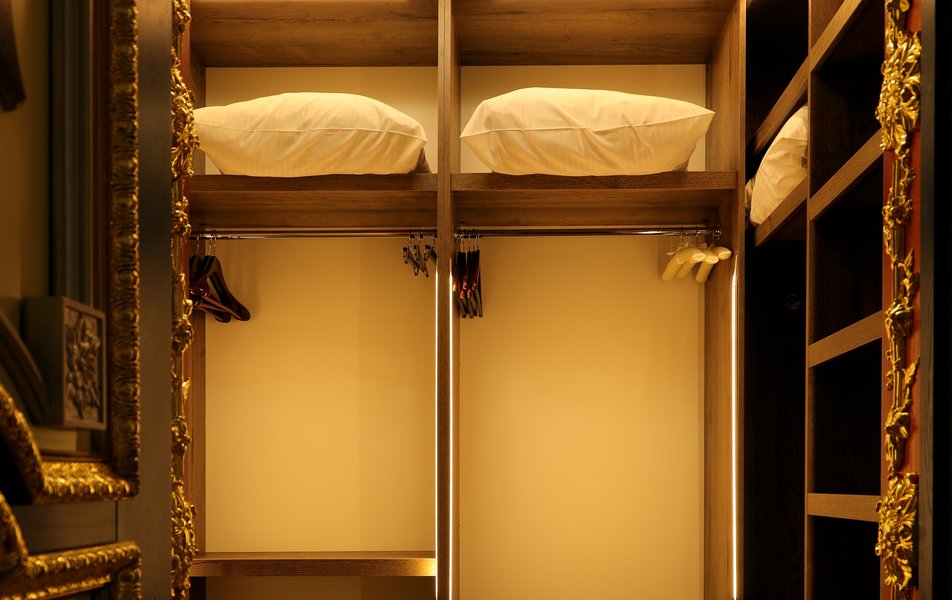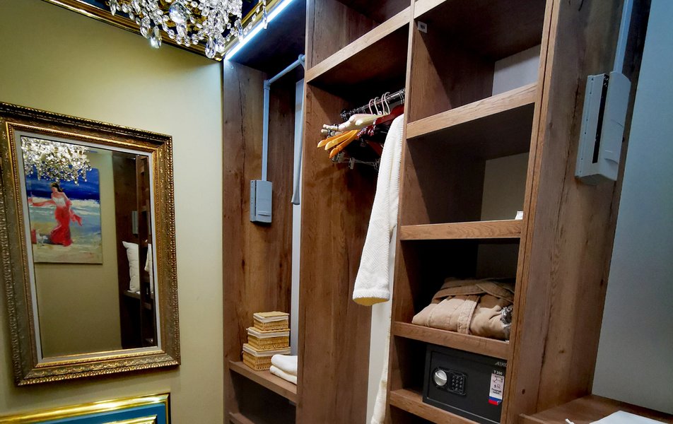 Оснащение номера: вешалка, гардеробная, зеркало, кровать двуспальная, набор мягкой мебели, прикроватные тумбочки, кондиционер, кофемашина, сейф, телевизор ЖК