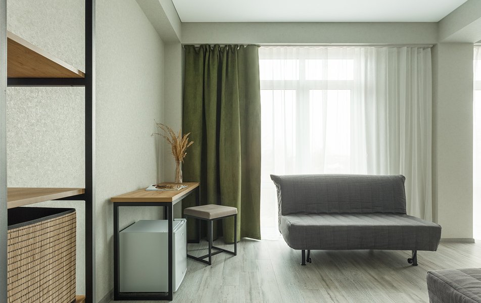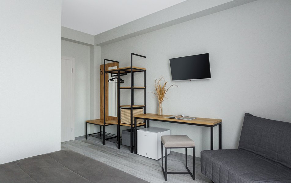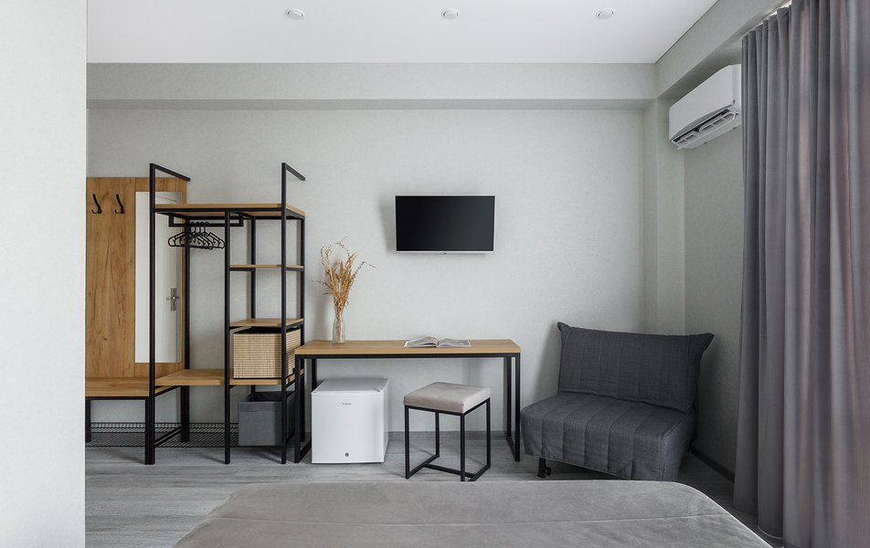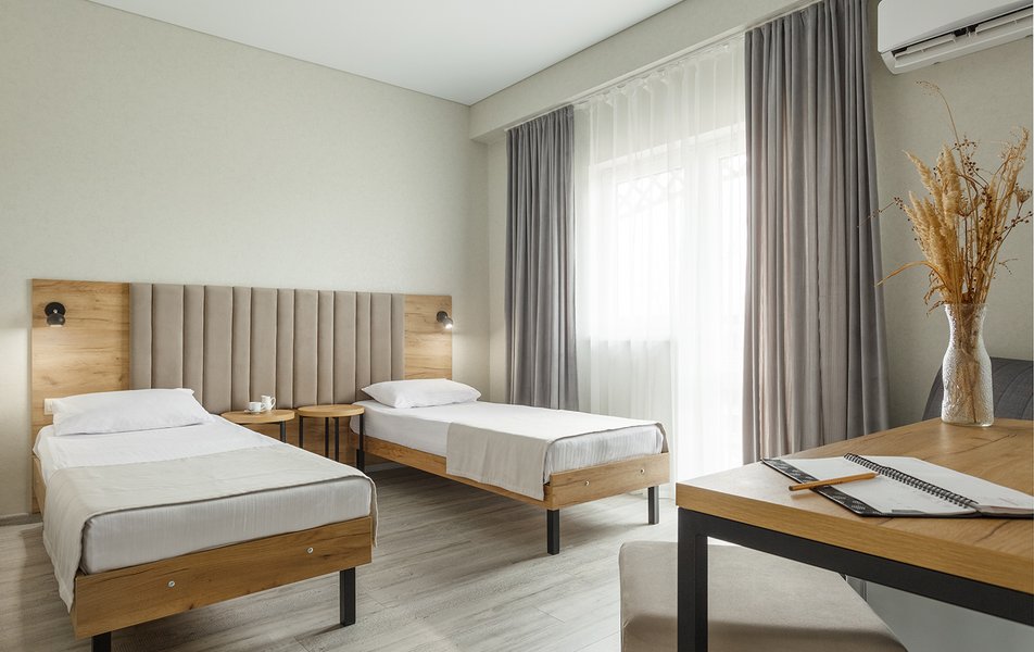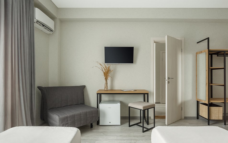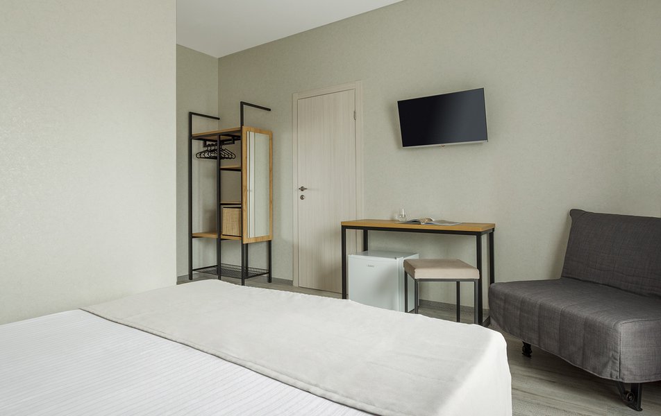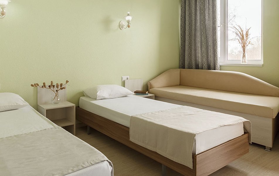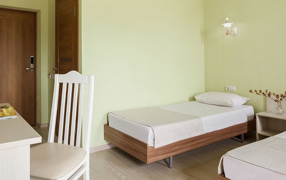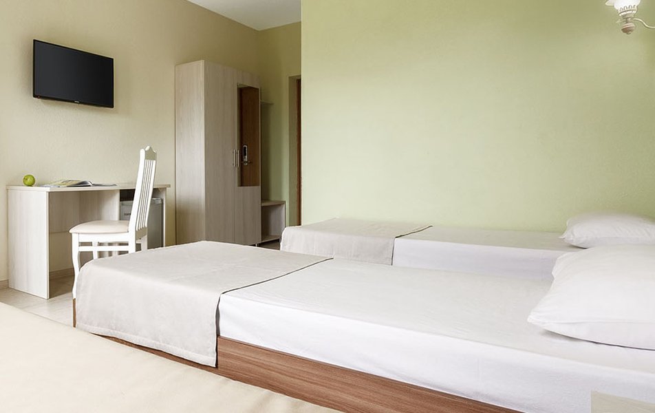 Оснащение номера: вешалка, диван, зеркало, кровати односпальные, прикроватные тумбочки, стол, стулья, шкаф, сплит-система, телевизор, холодильник