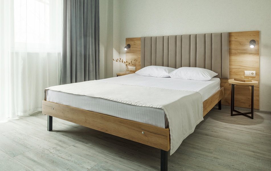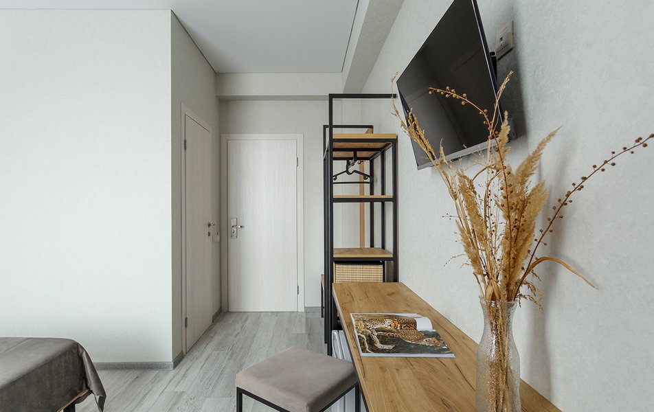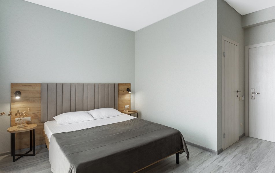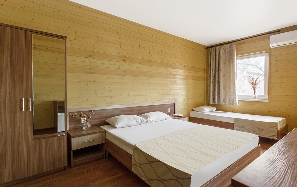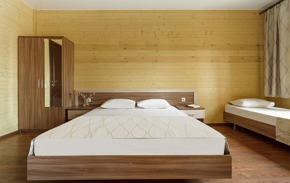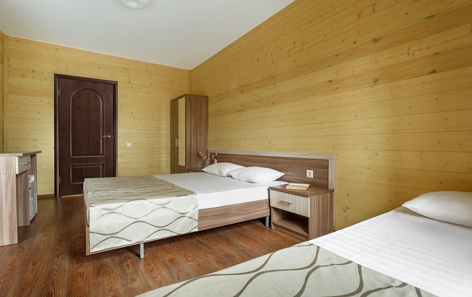 Оснащение номера: вешалка, зеркало, кровать односпальная, кровать двуспальная, прикроватные тумбочки, стол, стулья, шкаф, сплит-система, телевизор, холодильник