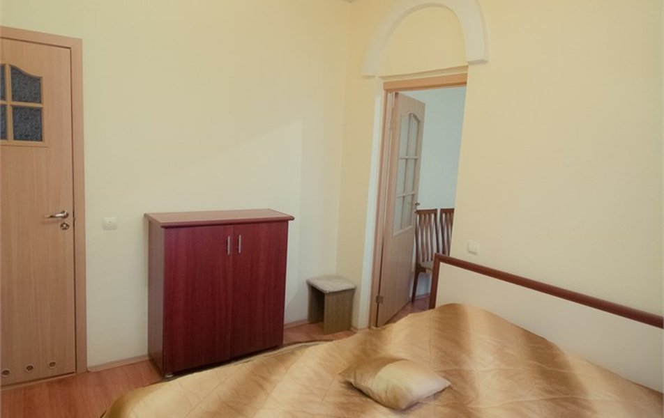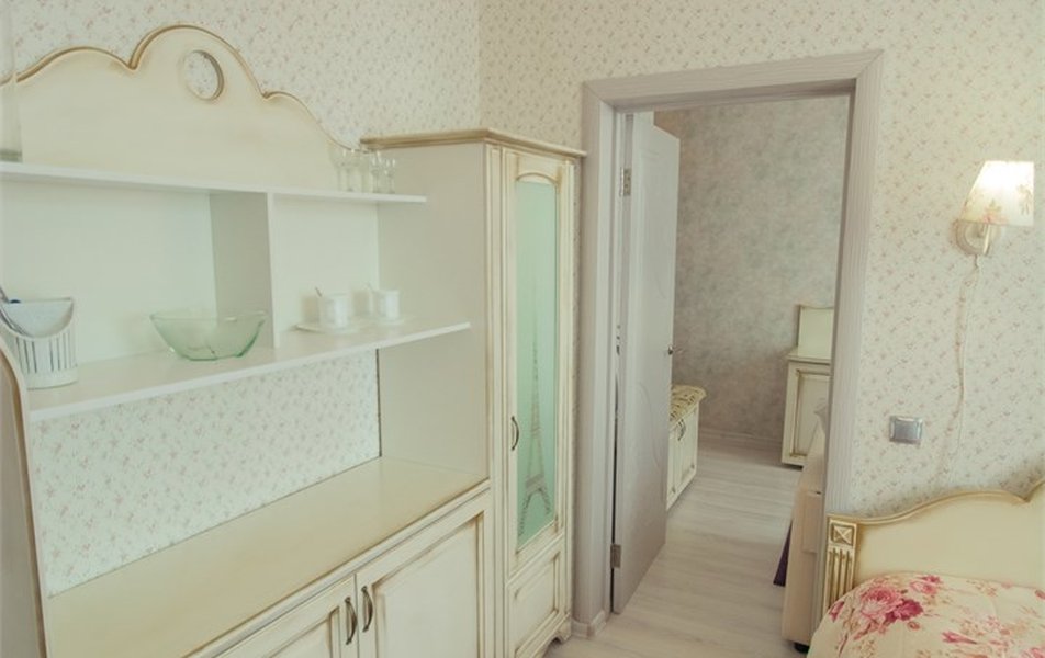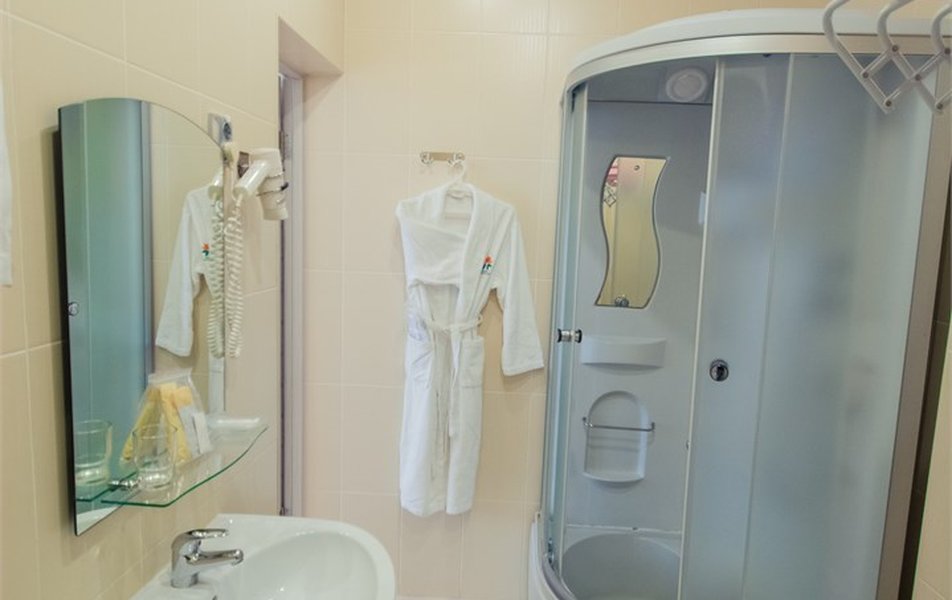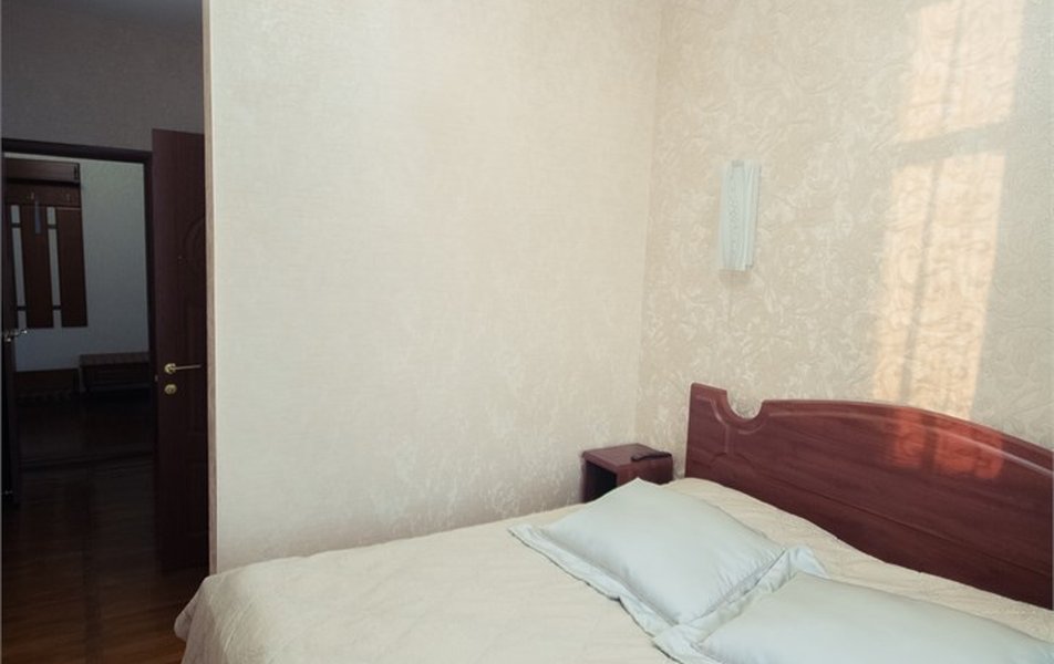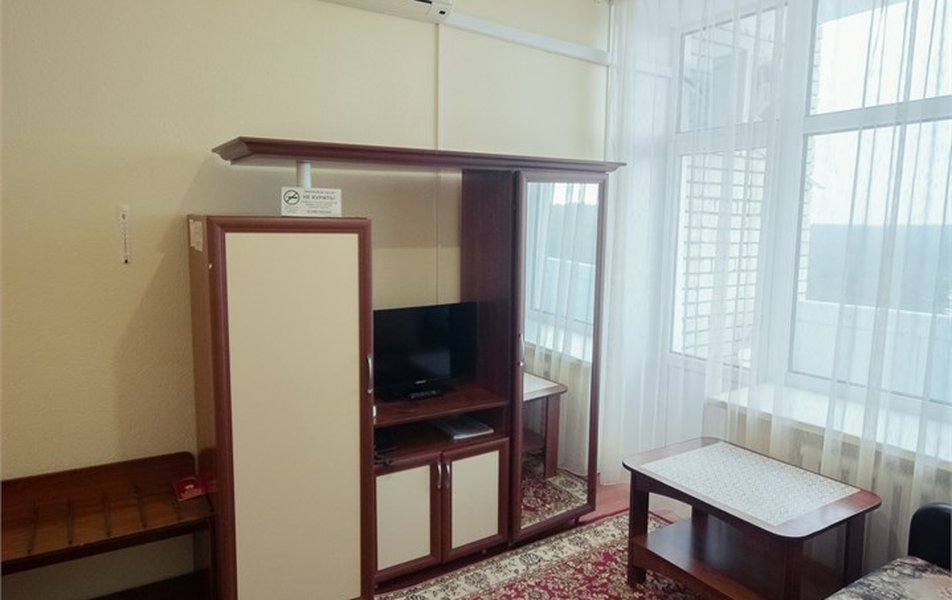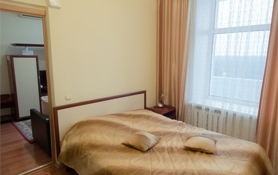 Оборудование номера: вешалка, зеркало, кресла, кровать двуспальная, прикроватные тумбочки, столик журнальный, шкаф, мини-холодильник, телевизор, телефон, чайный набор посуды