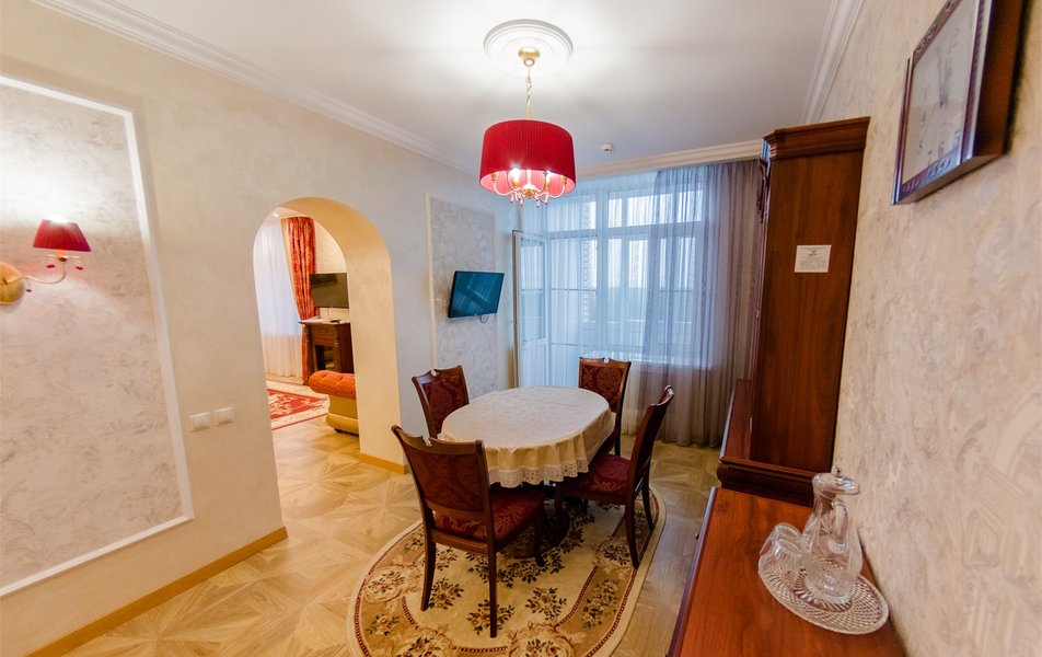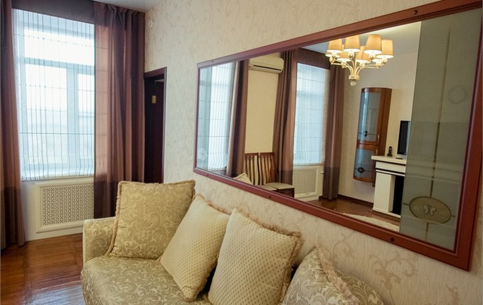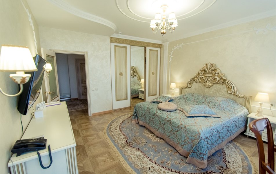 Оборудование номера: вешалка, зеркало, кровать двуспальная, набор мягкой мебели, прикроватные тумбочки, стол, стулья, шкаф, вентилятор, сейф, телевизор, телефон, холодильник, электрочайник