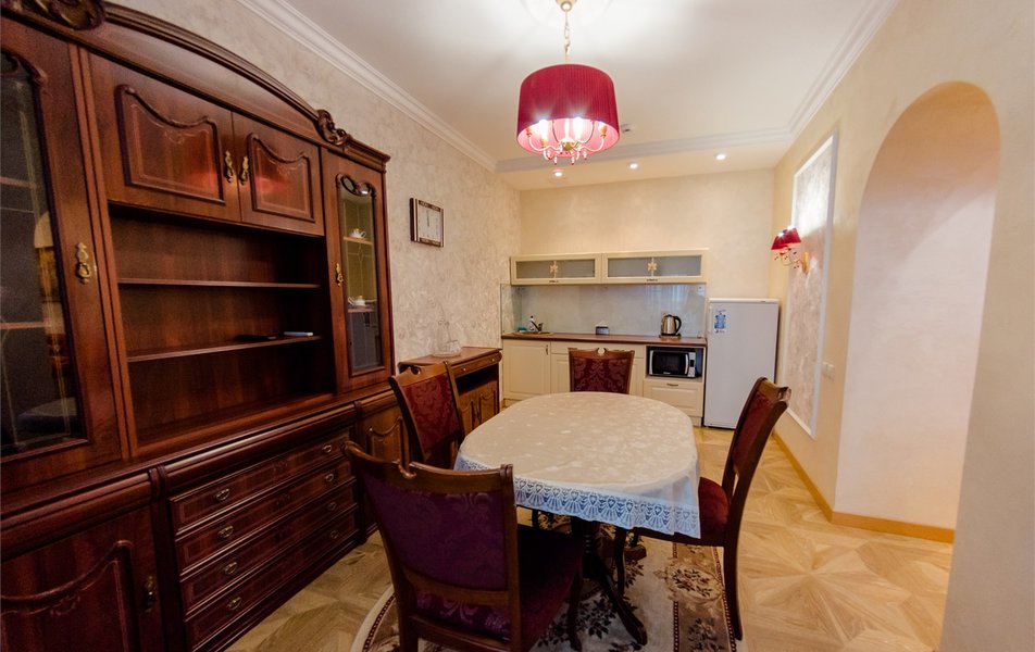 Оборудование номера: вешалка, зеркало, комод, кресла, кровать двуспальная, кухонная мебель, прикроватные тумбочки, столик журнальный, стулья, шкаф, мини-кухня, камин, кондиционер, микроволновая печь, мини-холодильник, телевизор, телефон, чайный набор посуды