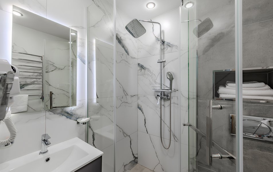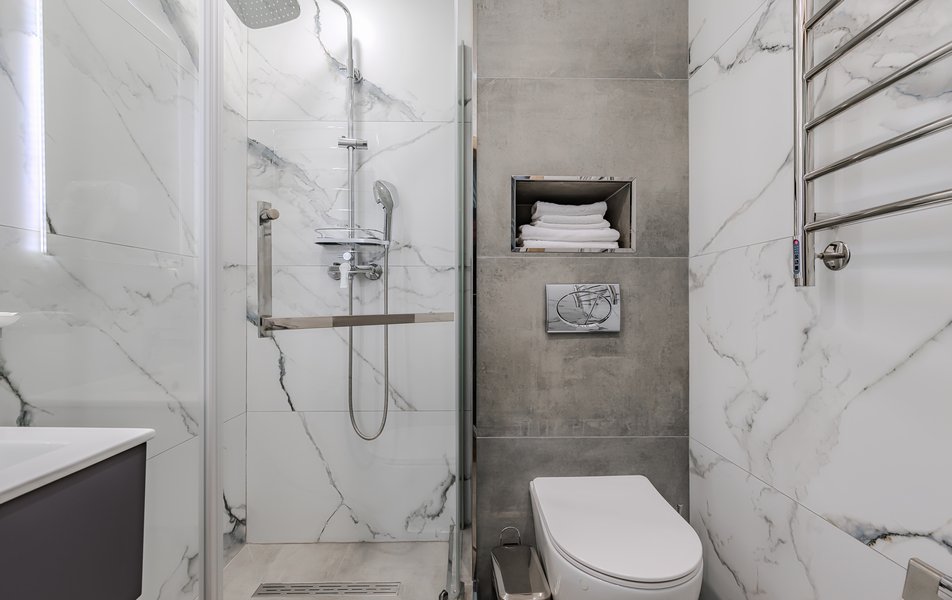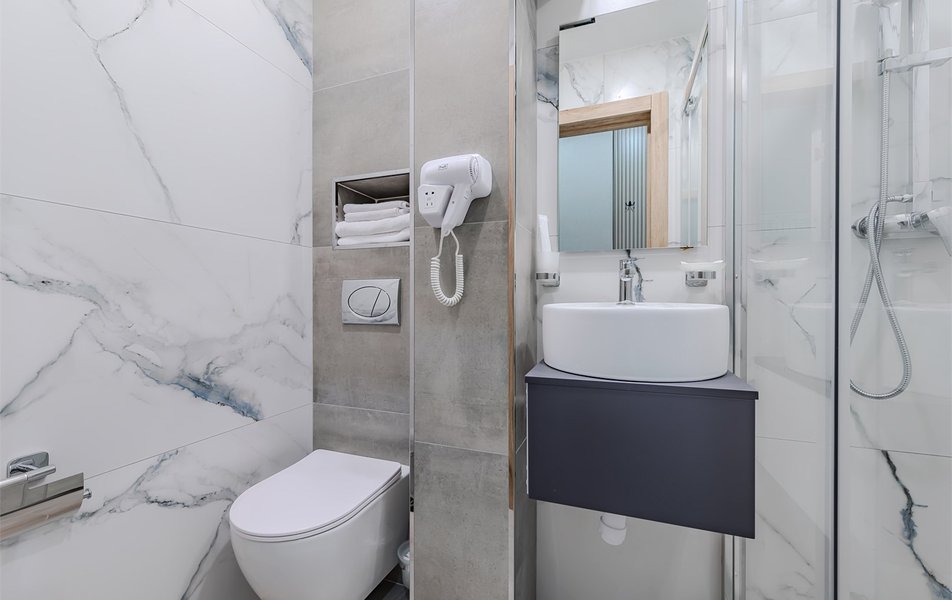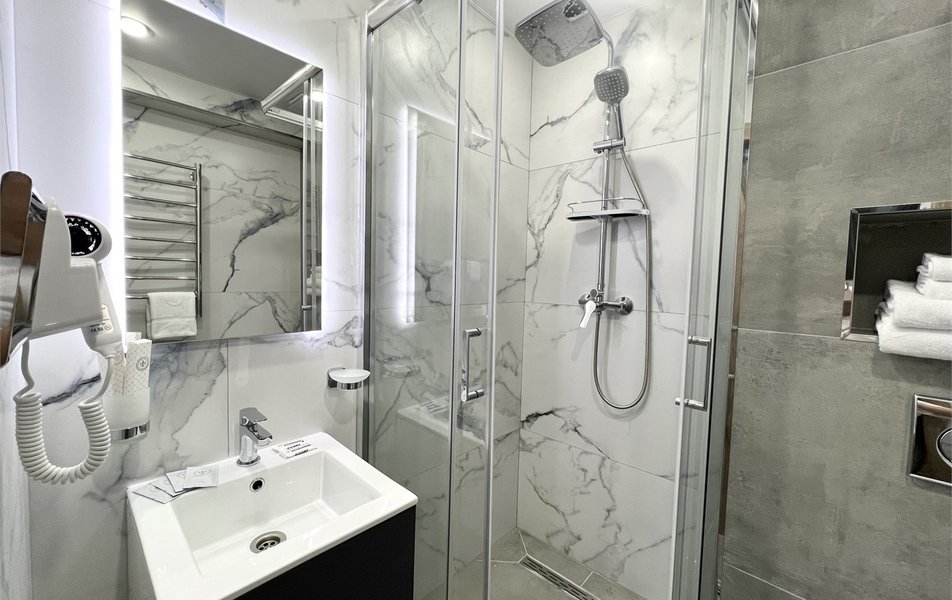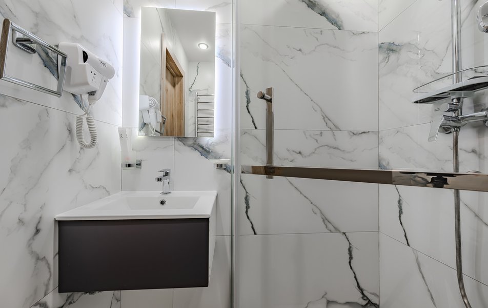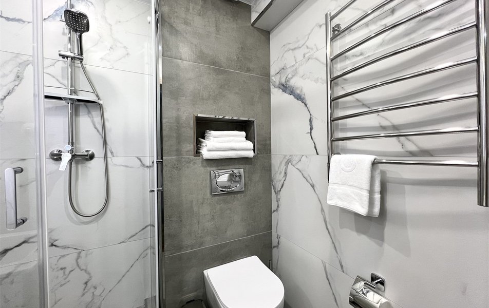 Сан.узел: душ, раковина, унитаз, тапочки, теплый пол, фен, халат