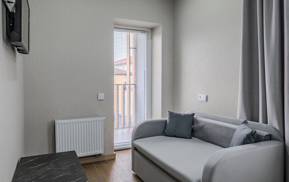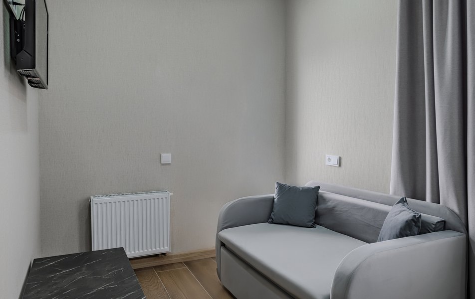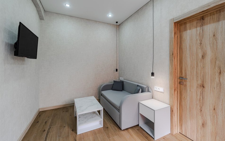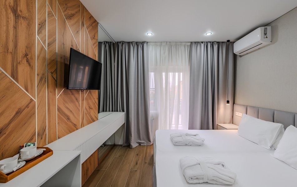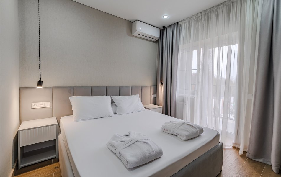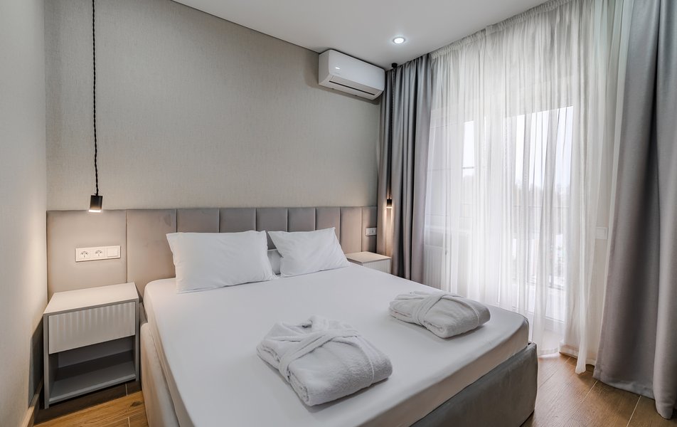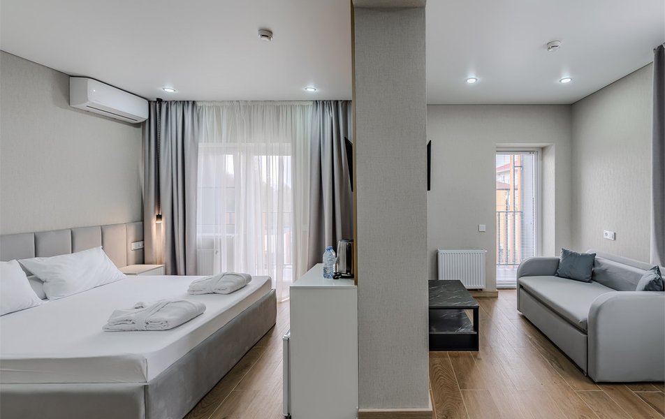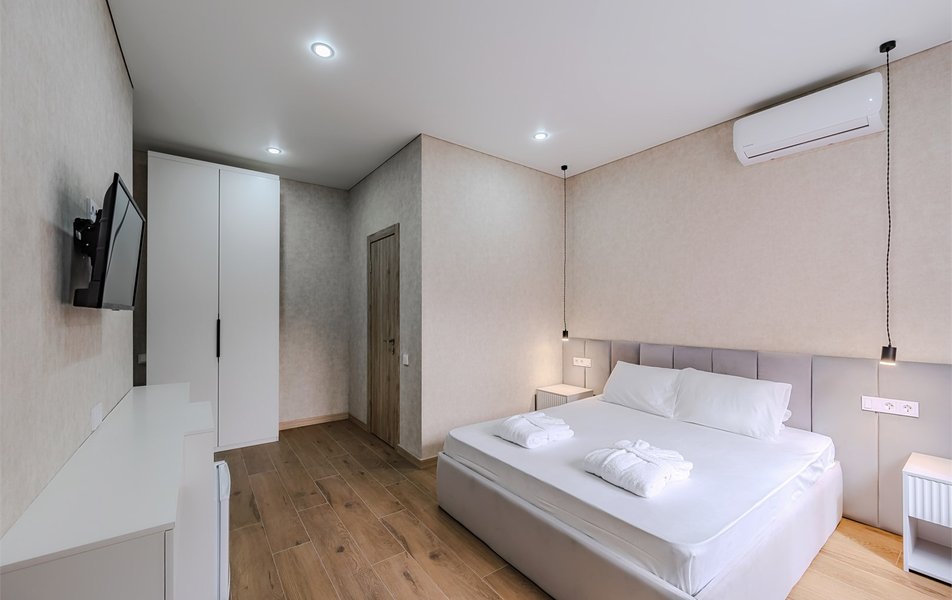 Оснащение номера: вешалка, диван раскладной: 120*200 см, зеркало, кровать двуспальная, прикроватные тумбочки, шкаф, кондиционер, мини-холодильник, сейф, телевизор, чайник