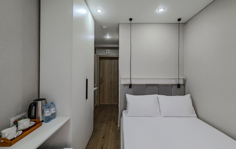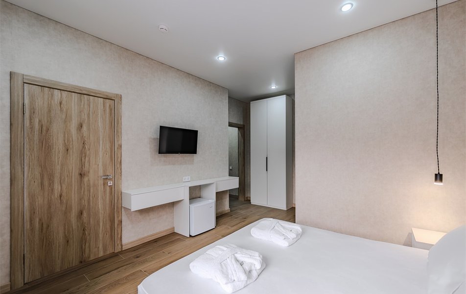 Оснащение номера: вешалка, зеркало, кровать полутороспальная, прикроватная тумбочка, шкаф, кондиционер, мини-холодильник, сейф, телевизор