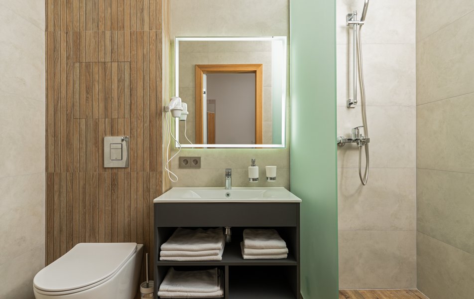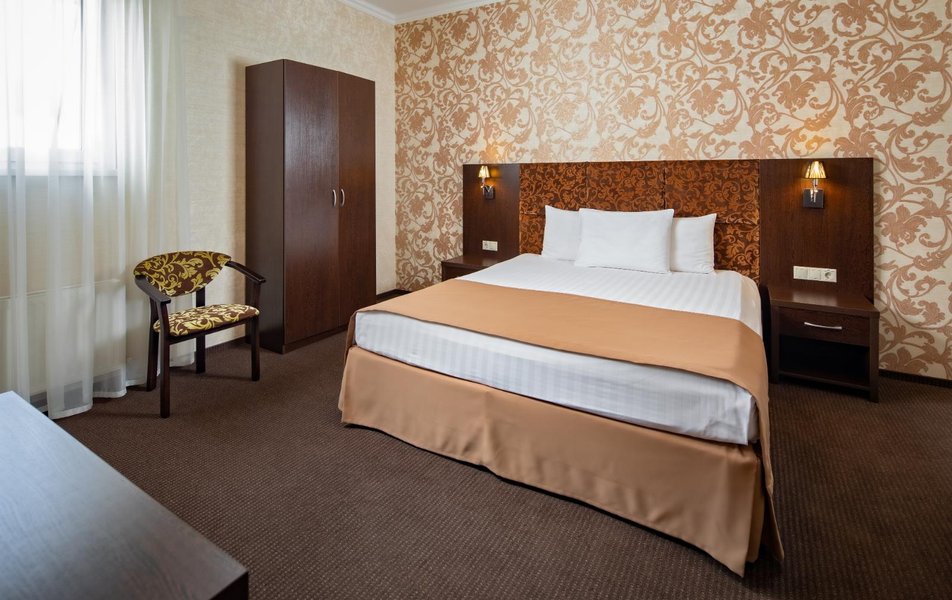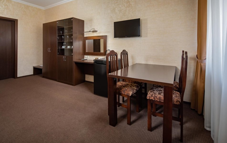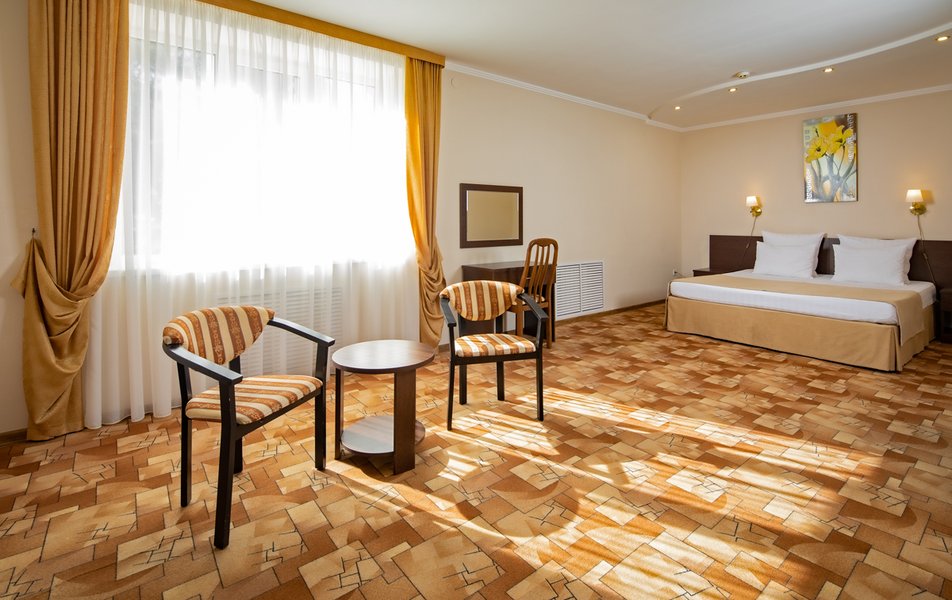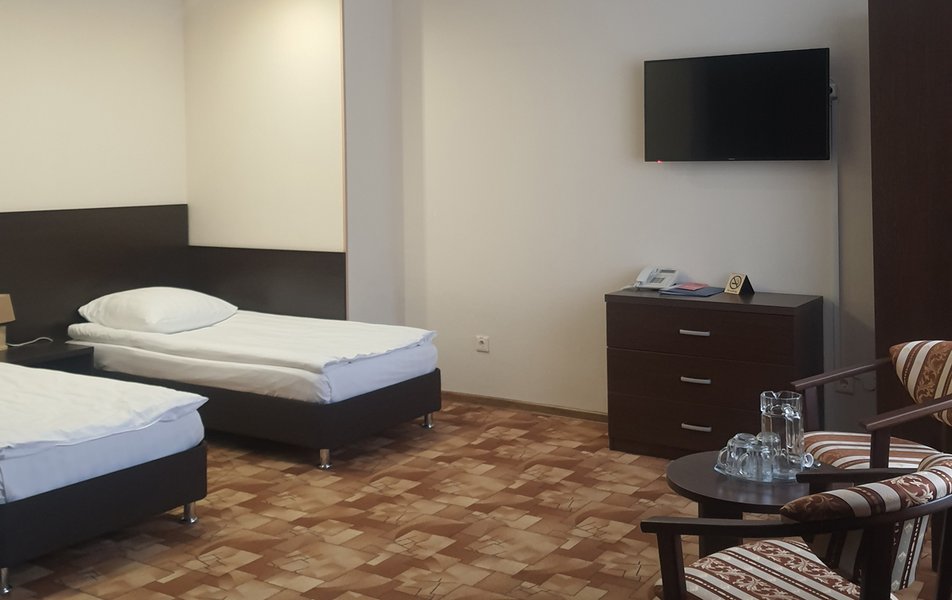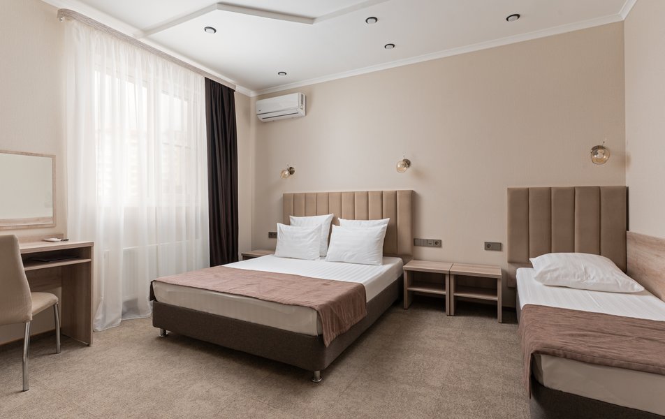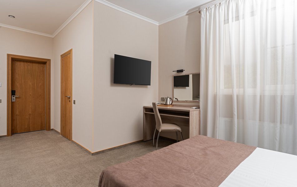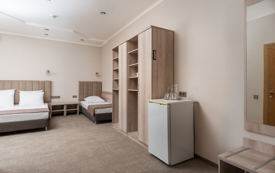 В номере: вешалка, зеркало, кровать двуспальная, кровать односпальная, прикроватные тумбочки, стол, стулья, шкаф, кондиционер, мини-холодильник, сейф, телевизор, чайный набор посуды, электрочайник