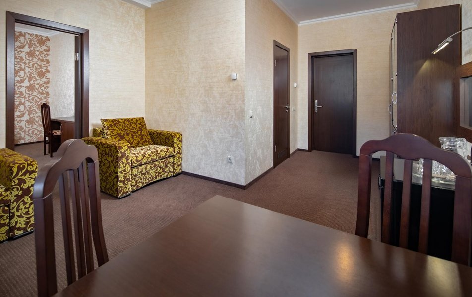 В номере: вешалка, зеркало, кресло-кровать: 2, кровать двуспальная, прикроватные тумбочки, стол, стулья, шкаф, кондиционер, мини-холодильник, сейф, телевизор, чайный набор посуды, электрочайник