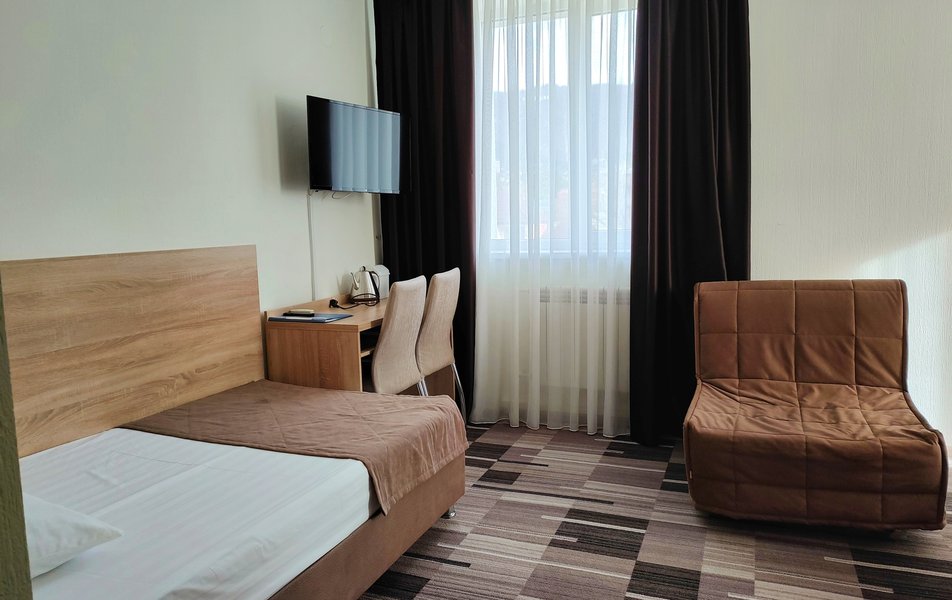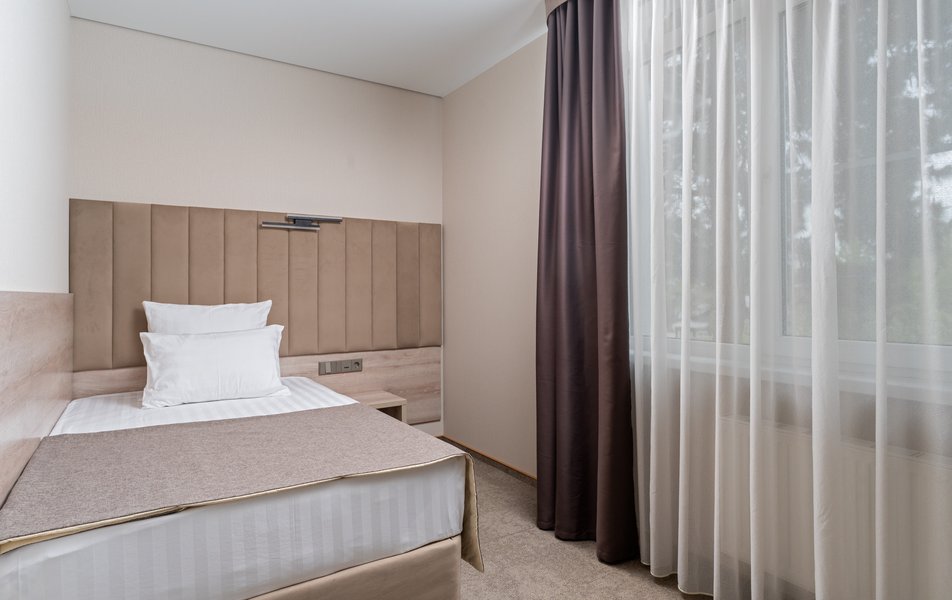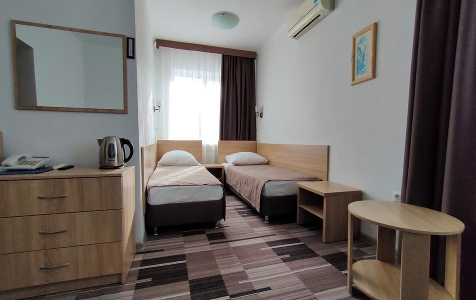 В номере: вешалка, зеркало, кровать односпальная, прикроватный столик, стол, стул, шкаф, кондиционер, мини-холодильник, сейф, телевизор, чайный набор посуды, электрочайник