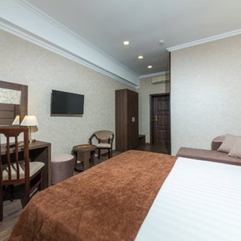 Оснащение номера: вешалка, диван раскладной, зеркало, кресло-кровать, кровати односпальные: 2, прикроватные тумбочки, стол, стул, шкаф, мини-холодильник, сейф, телевизор, чайный набор посуды, электрочайник