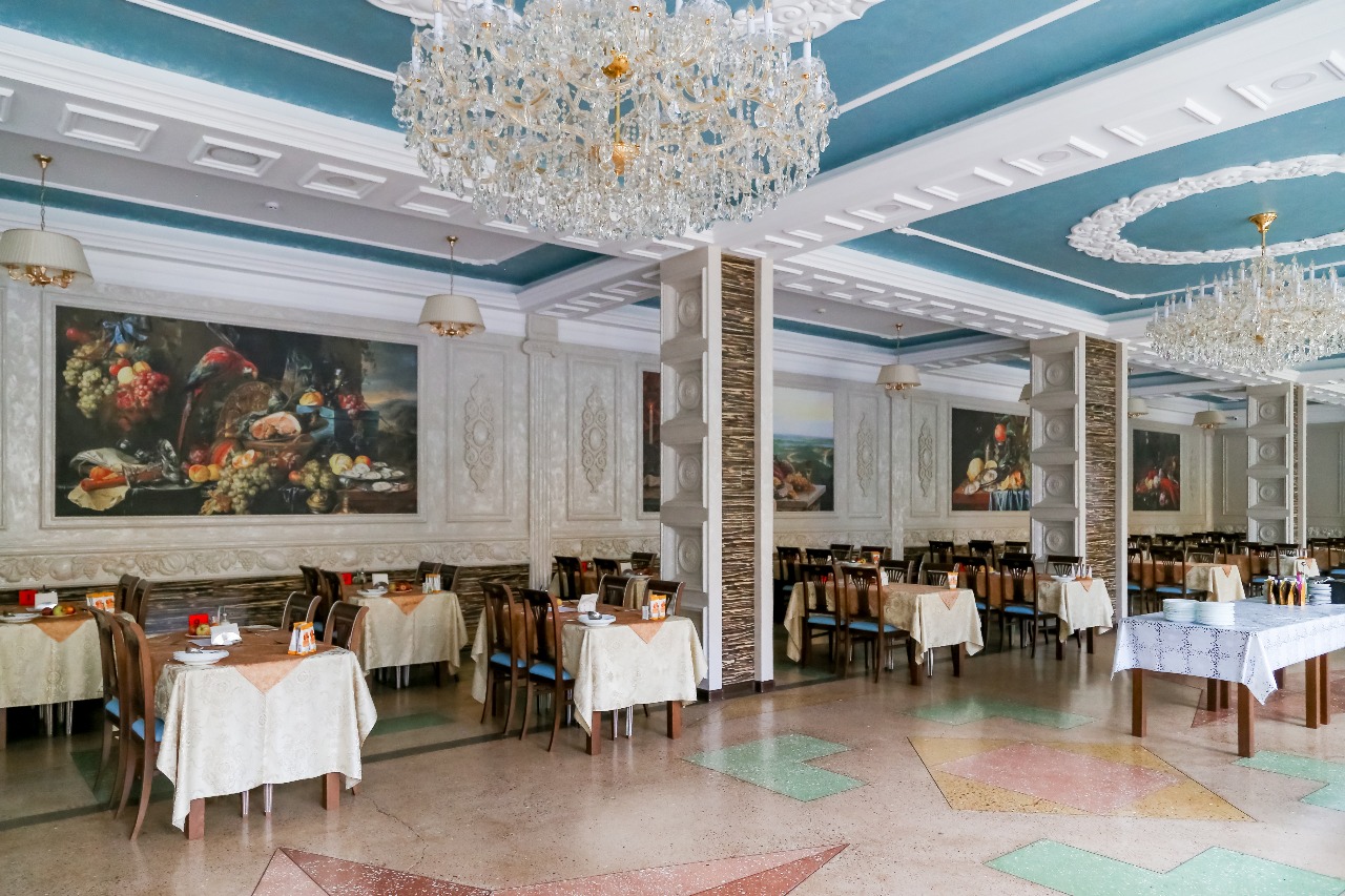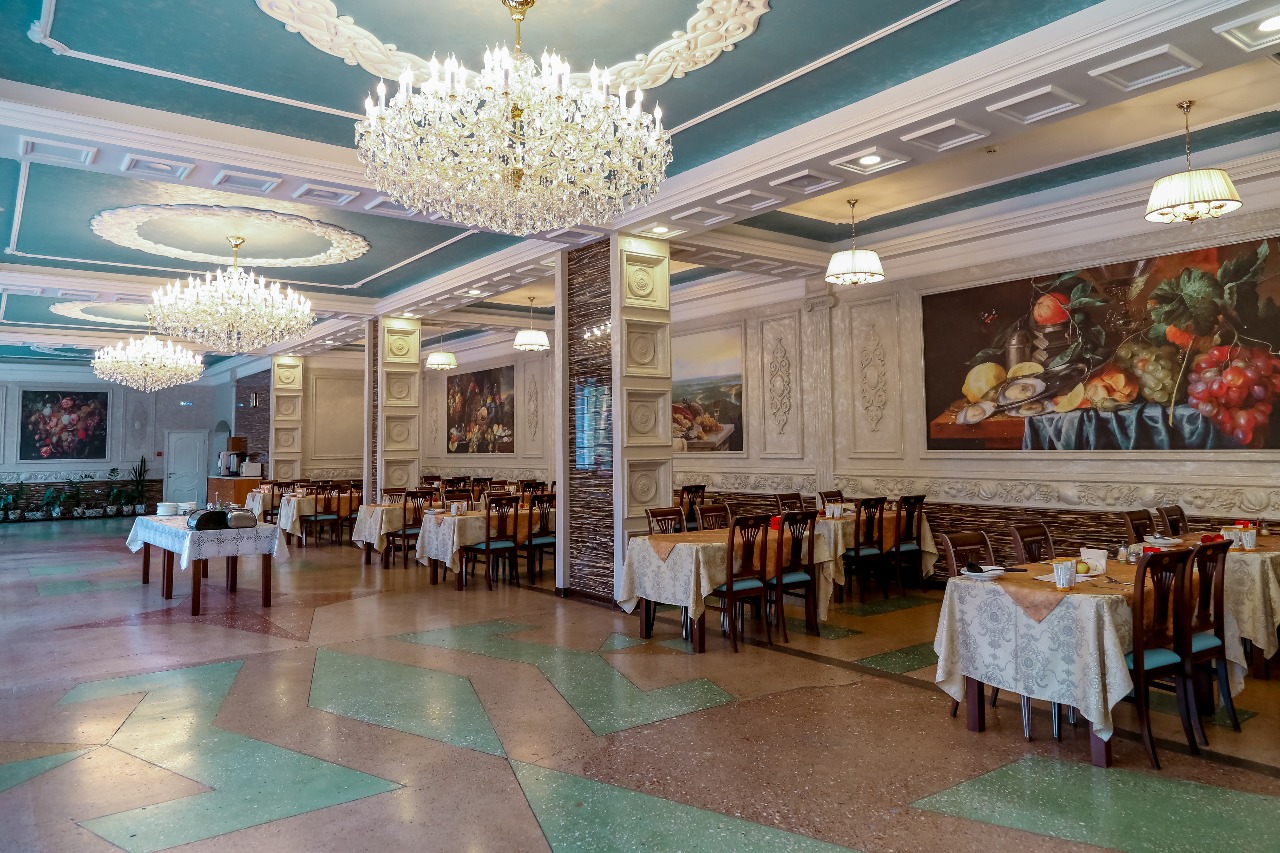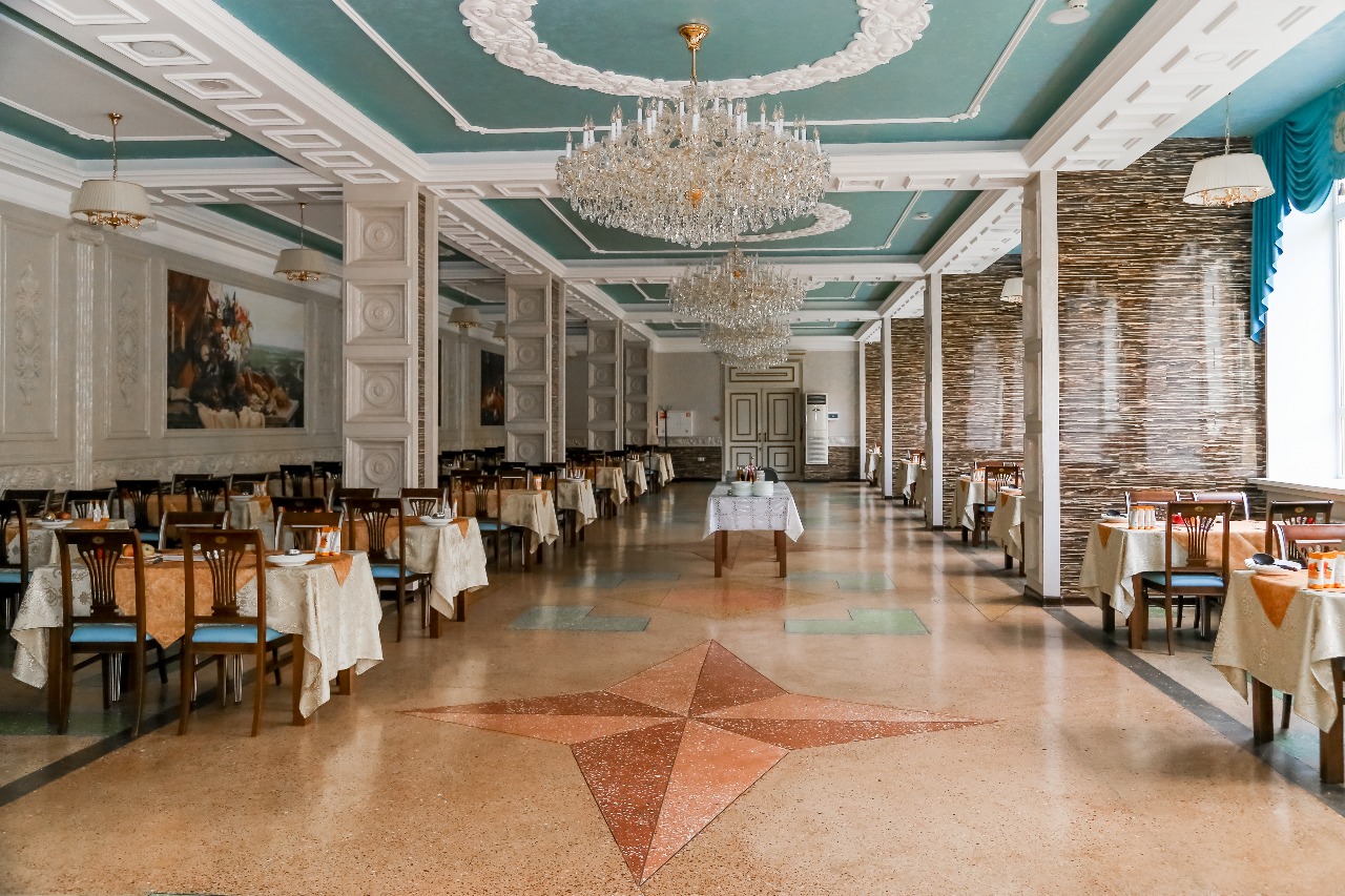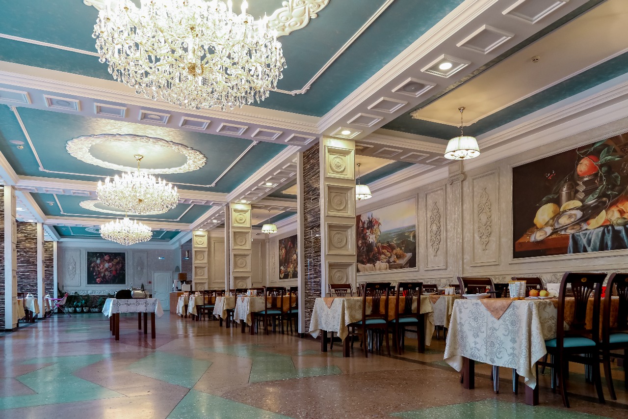 - Дизайн: нежные пастельные тона, хрустальные люстры, бархатные шторы, мраморные детали и изящная лепка