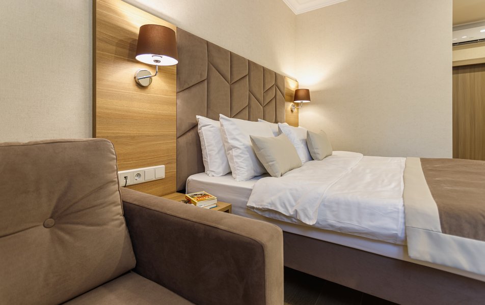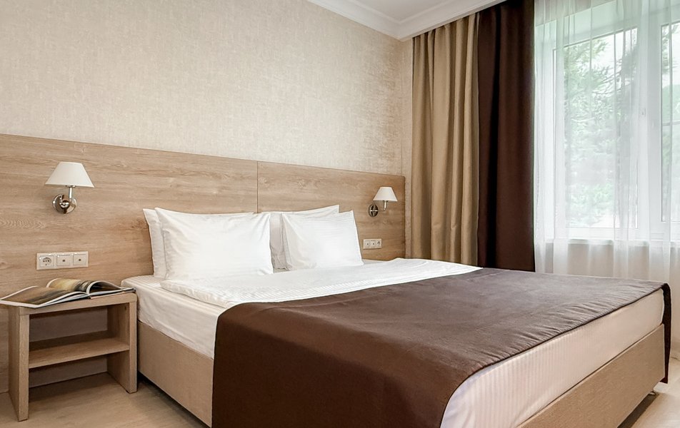 Оснащение номера: вешалка, кресло-кровать, кровать двуспальная, прикроватные тумбочки, стол, стул, шкаф, сейф, сплит-система, телевизор, телефон, холодильник, чайная станция