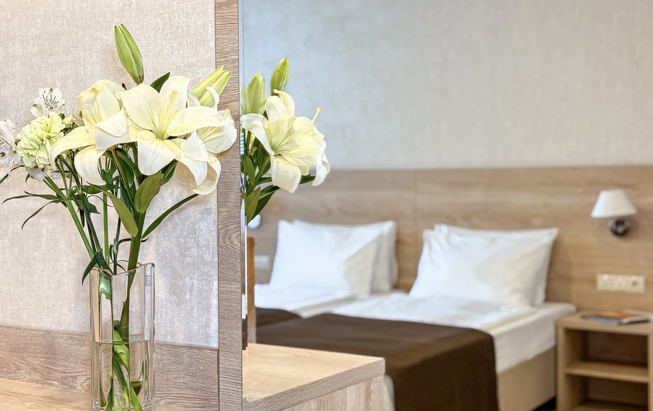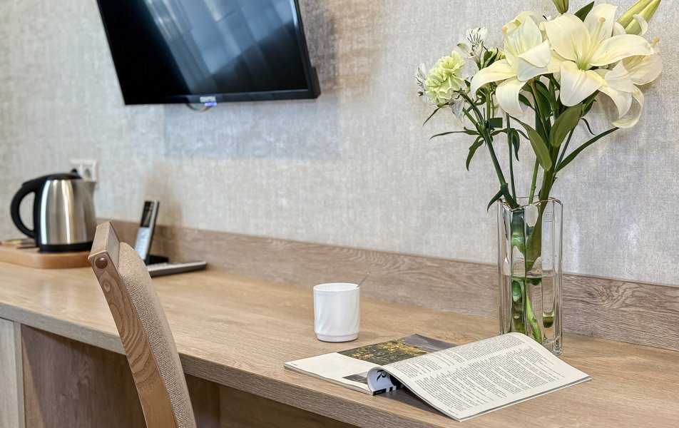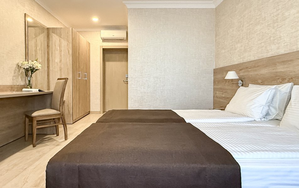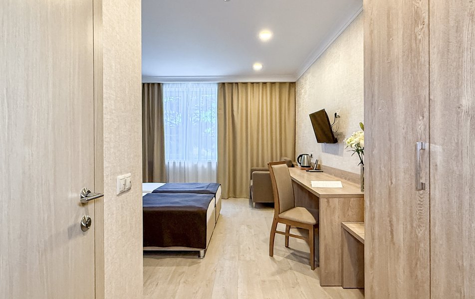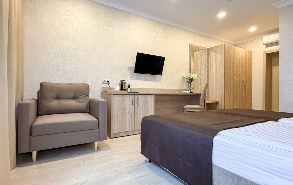 Оснащение номера: вешалка, кресло-кровать, кровати односпальные, прикроватные тумбочки, стол, стул, шкаф, сейф, сплит-система, телевизор, телефон, холодильник, чайная станция