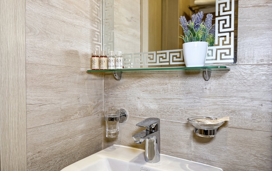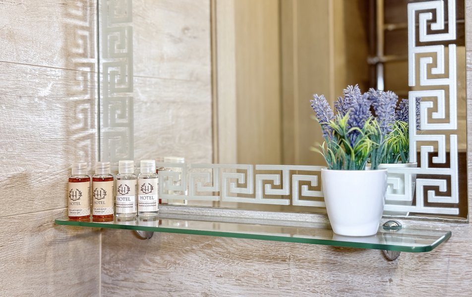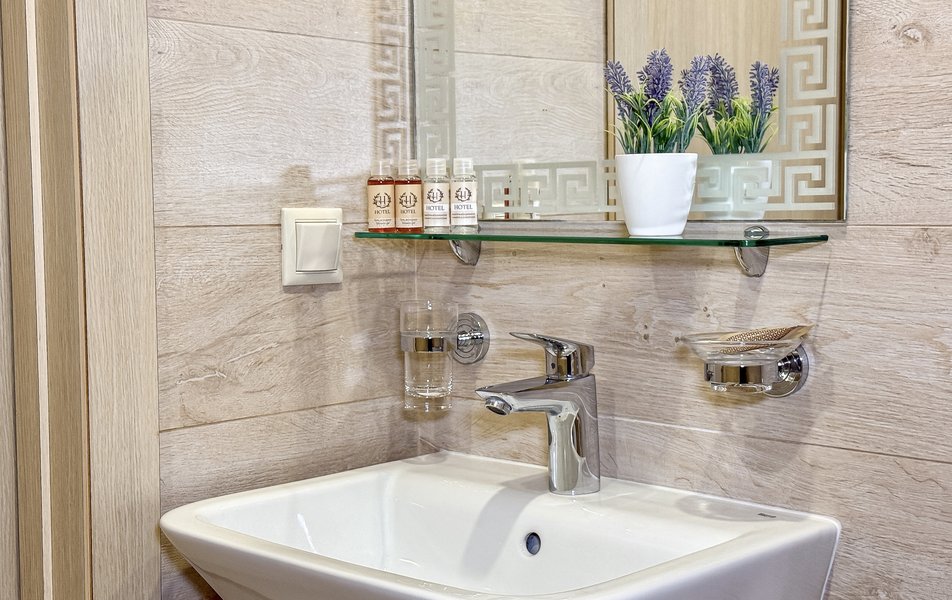 Сан.узел: душ, раковина, унитаз, тапочки, туалетные принадлежности, фен