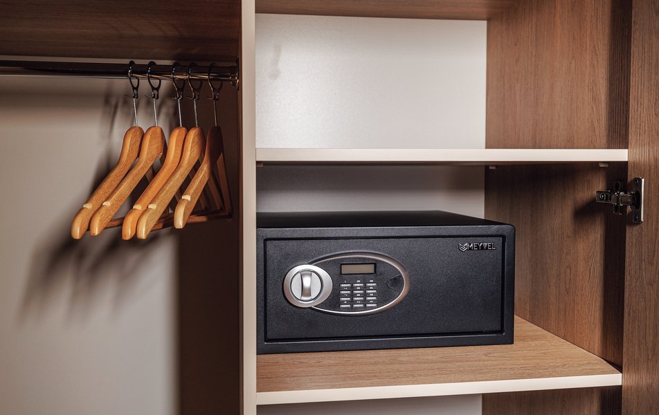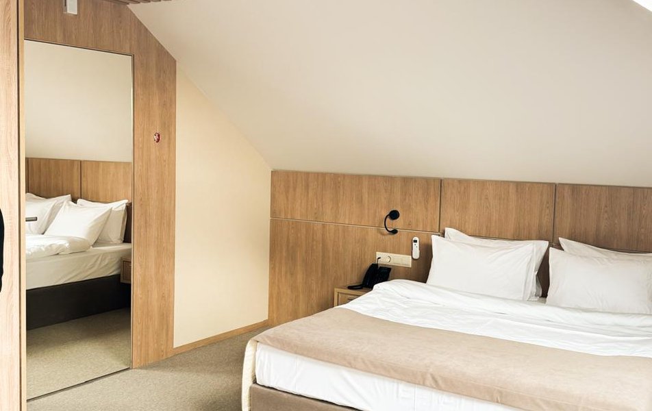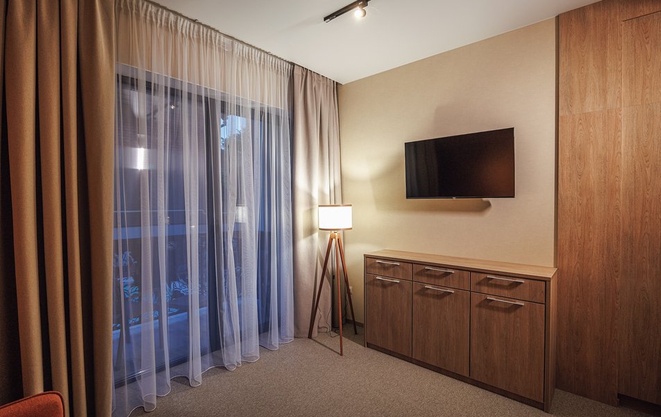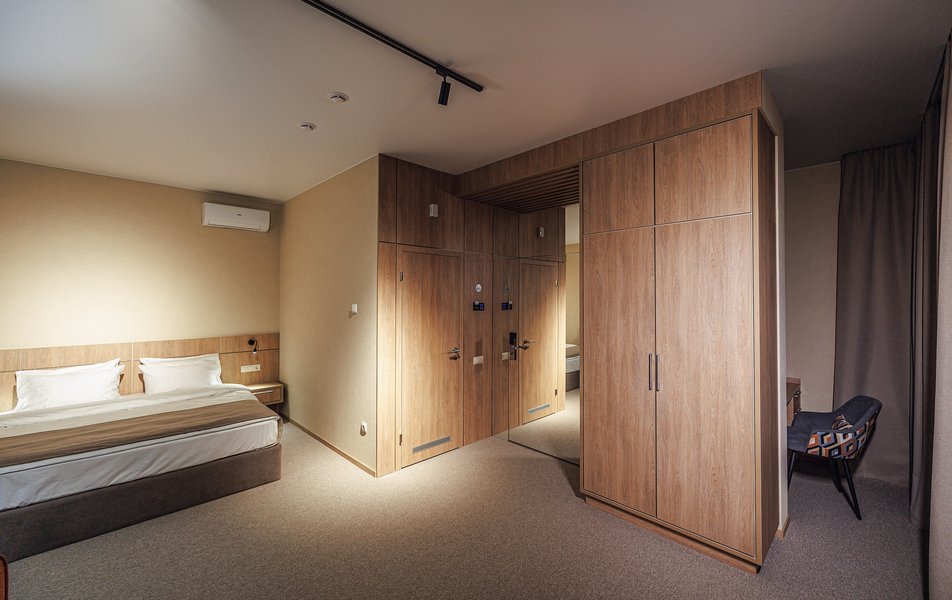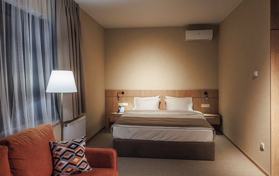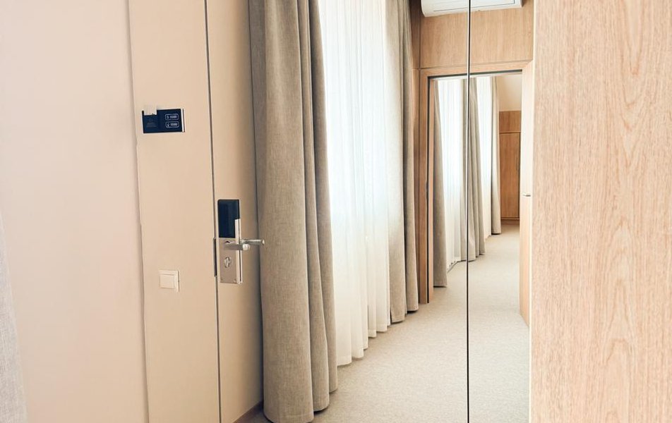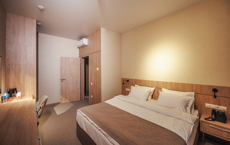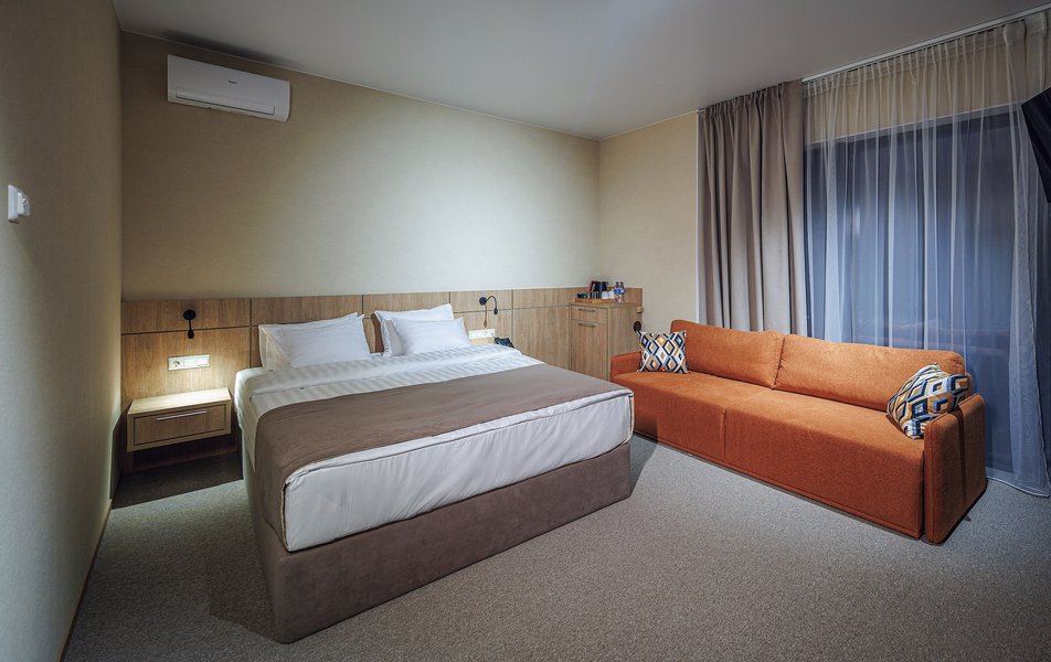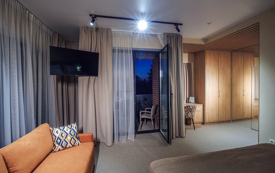 Оснащение номера: вешалка, диван раскладной, зеркало, ковровое покрытие, кровать двуспальная, прикроватные тумбочки, стол, столик туалетный, стул, шкаф, кондиционер, набор посуды, сейф, телевизор, телефон, холодильник, электрочайник