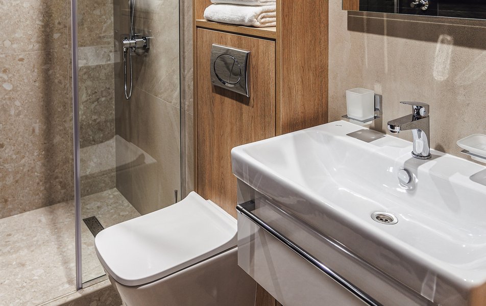 Сан.узел: душевая кабина, раковина, унитаз, туалетные принадлежности, фен