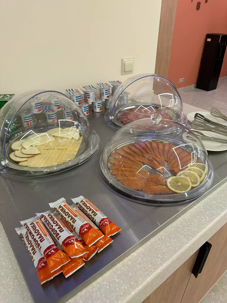 На цокольном этаже расположено кафе на 40 посадочных мест, где для гостей отеля организованы завтраки по системе «шведский стол».