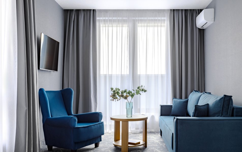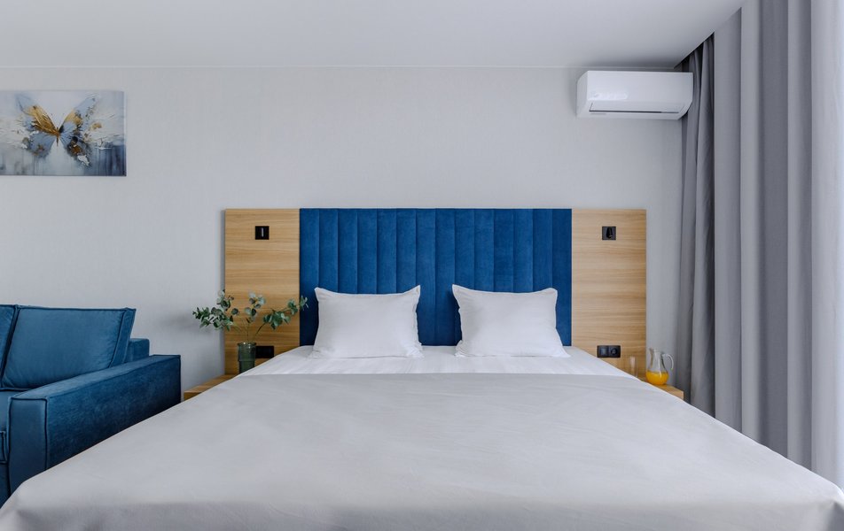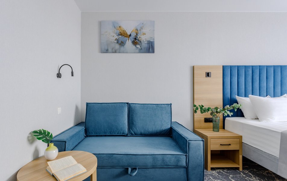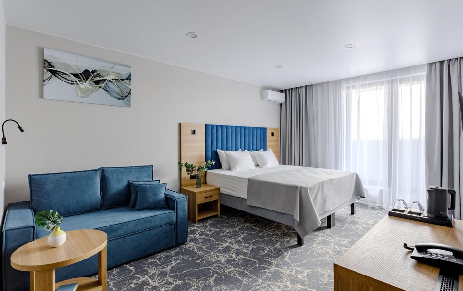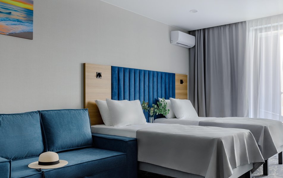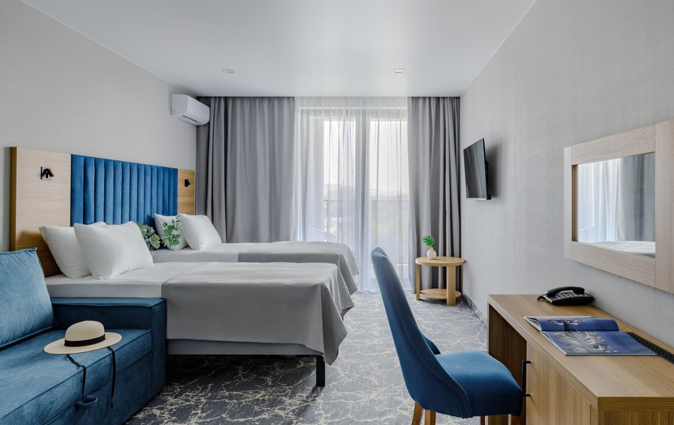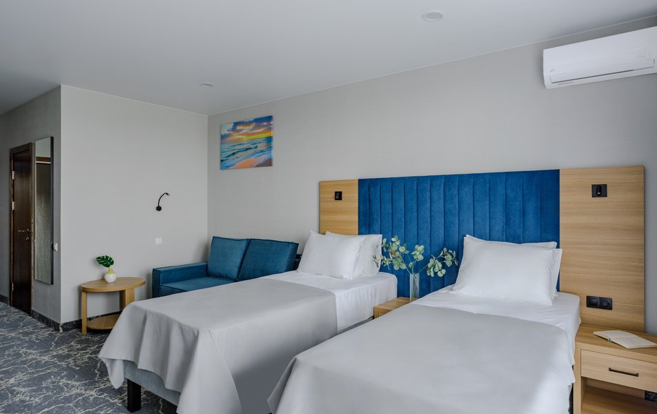 Оснащение номера: вешалка, диван, зеркало, кровати односпальные /одна двуспальная кровать, прикроватные тумбочки, стол, стулья, шкаф, мини-холодильник, сейф, сплит-система, телевизор, телефон, электрочайник