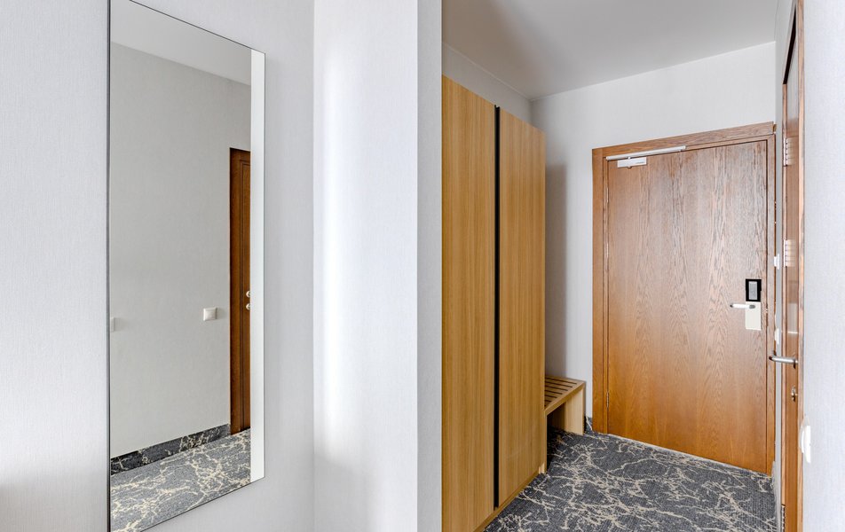 Оснащение номера: вешалка, диван, зеркало, кровати односпальные, прикроватные тумбочки, стол, стулья, шкаф, мини-холодильник, сейф, сплит-система, телевизор, телефон, электрочайник
