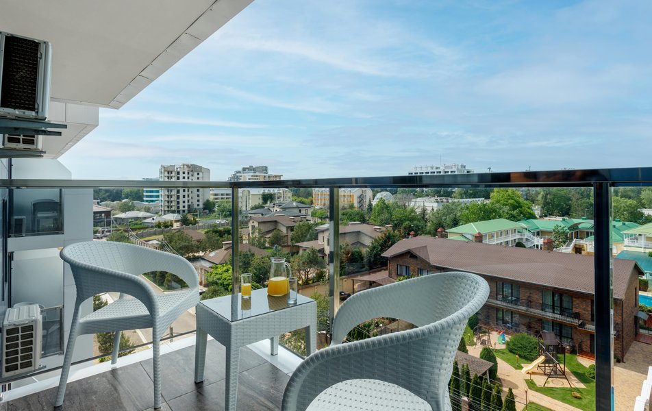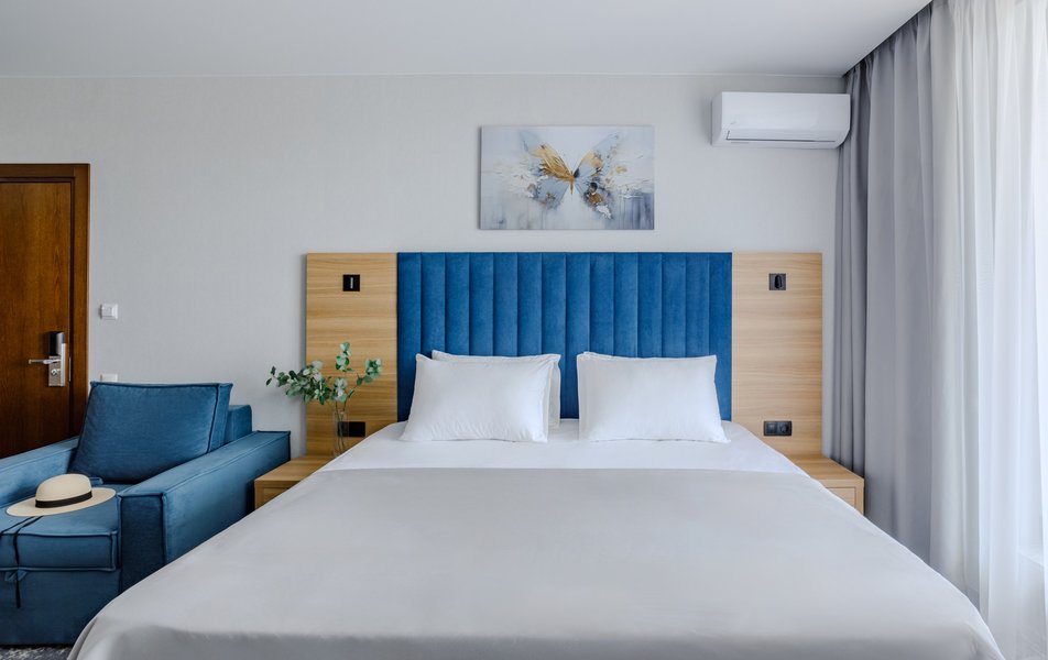 Оснащение номера: вешалка, диван, зеркало, двуспальная кровать, прикроватные тумбочки, стол, стулья, шкаф, мини-холодильник, сейф, сплит-система, телевизор, телефон, электрочайник