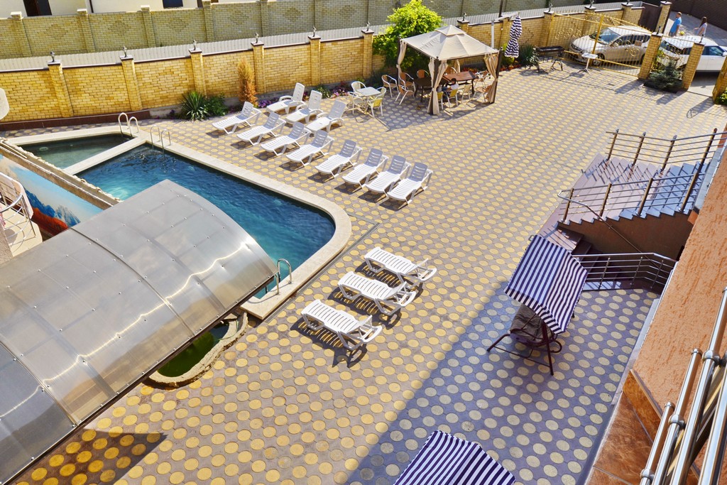 Центральным элементом территории стал просторный открытый бассейн с подогревом, оснащённый водопадом, детским отделением и зоной для релаксации. Рядом работает летний бар, где можно освежиться в жаркий день. В теплое время года здесь регулярно проходят анимационные программы — как дневные, так и вечерние, особенно популярные у детей.