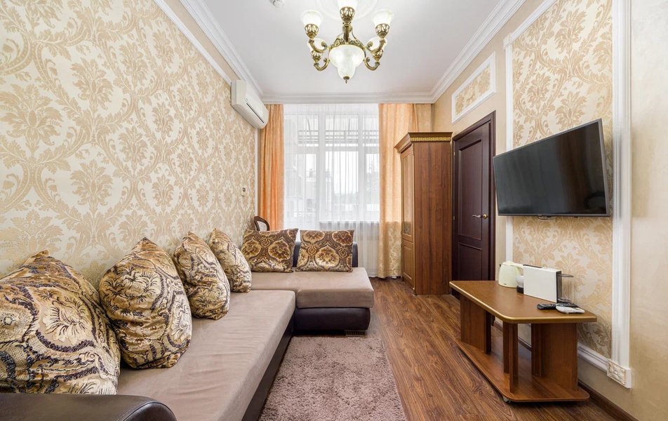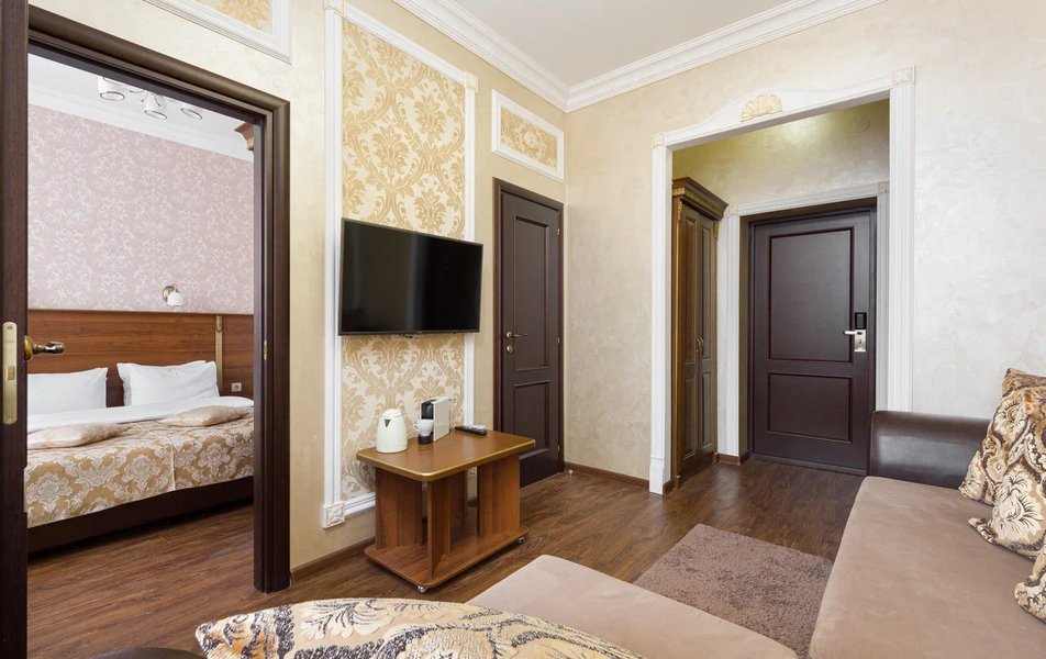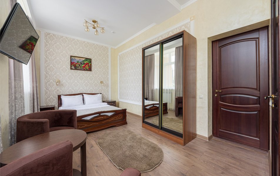 В номере: вешалка, зеркало, кровать двуспальная/ две полутороспальные кровати, прикроватные тумбочки, стол, стулья, диван, шкаф, кондиционер, мини-холодильник, набор посуды, сейф, телевизор, электрочайник