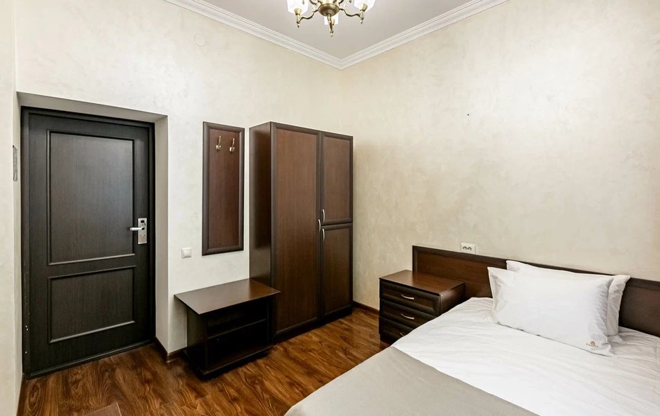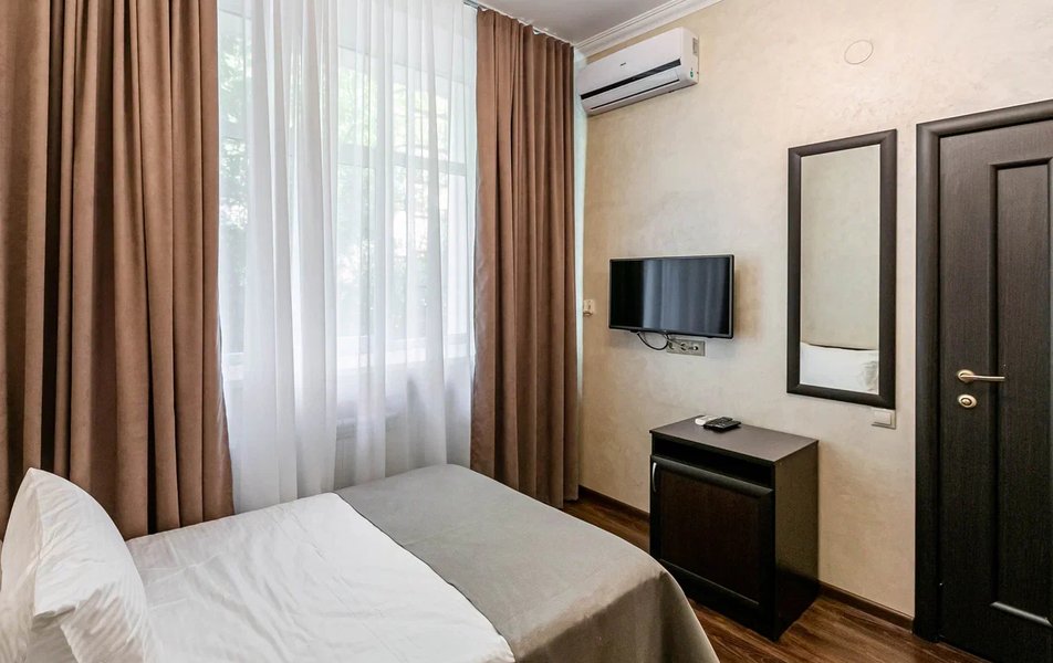 В номере: вешалка, зеркало, кровать односпальная, прикроватные тумбочки, стол, стулья, шкаф, кондиционер, мини-холодильник, набор посуды, сейф, телевизор, электрочайник
