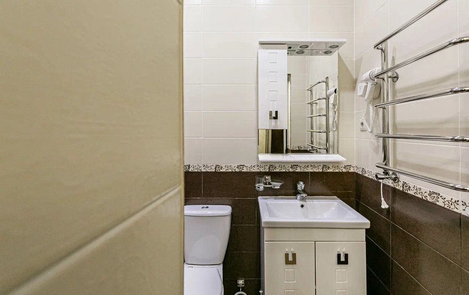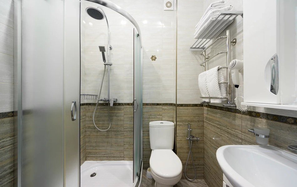 Санузел: душевая кабина или ванна, раковина, унитаз, тапочки, туалетные принадлежности, фен, халат