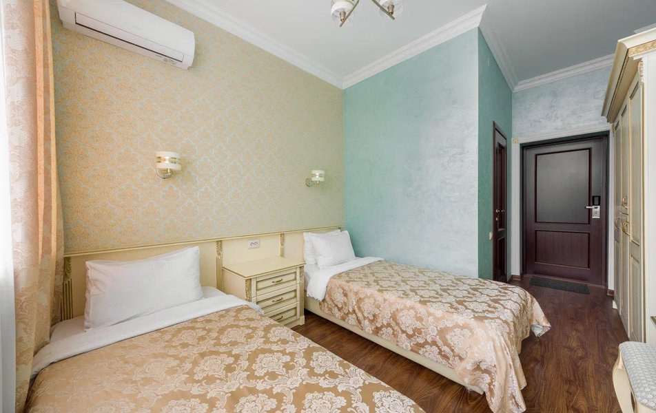 В номере: вешалка, зеркало, кровать полутороспальная: 2, прикроватные тумбочки, стол, стулья, шкаф, кондиционер, мини-холодильник, набор посуды, сейф, телевизор, электрочайник