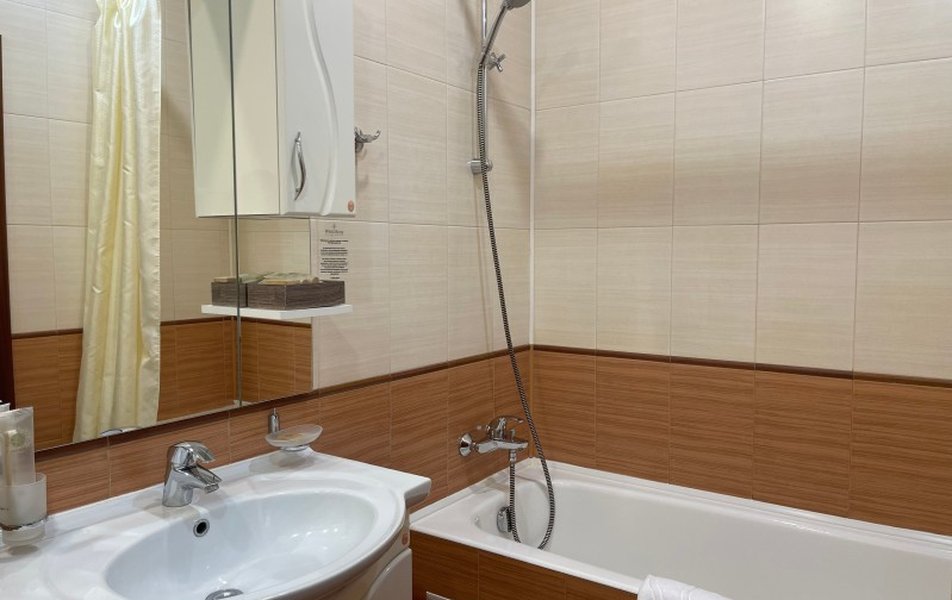 Сан/узел: душ или ванна, раковина, унитаз, тапочки, туалетные принадлежности, фен