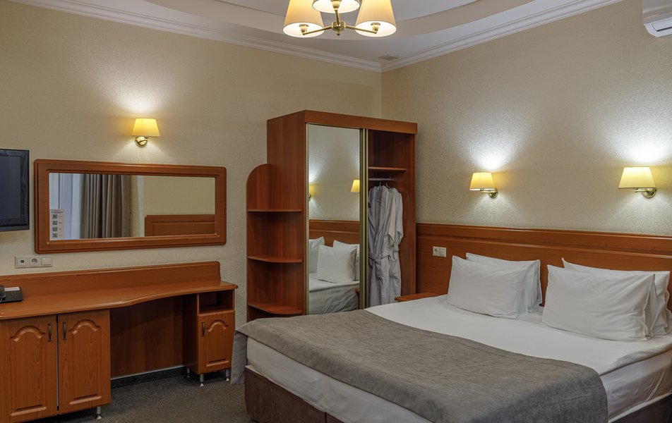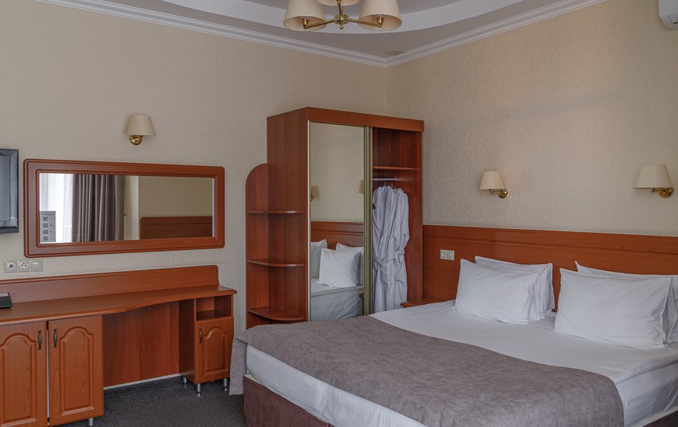 Оснащение номера: зеркало, кровати односпальные /одна двуспальная кровать, прикроватные тумбочки, стол, столик журнальный, стулья, шкаф, кондиционер, телевизор ЖК, холодильник, электрочайник