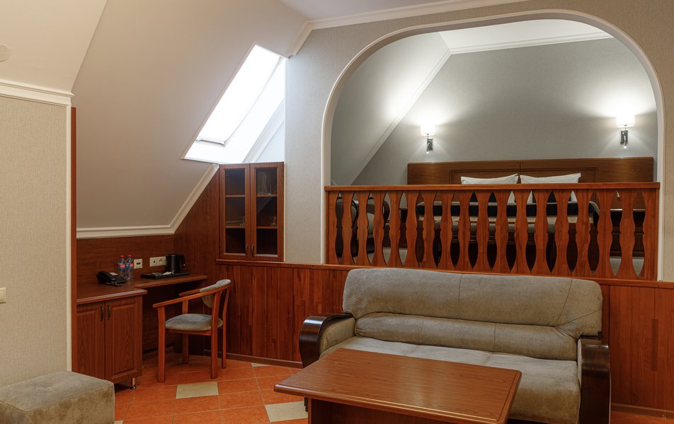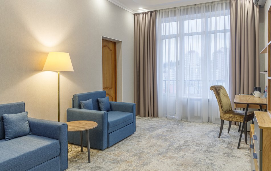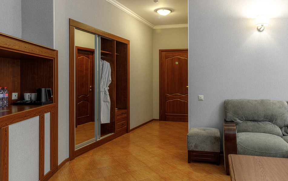 Оснащение номера: зеркало, кресло-кровать, кровати односпальные /одна двуспальная кровать, набор мягкой мебели, прикроватные тумбочки, стол, столик журнальный, стулья, шкаф, кондиционер, телевизор ЖК, холодильник, электрочайник