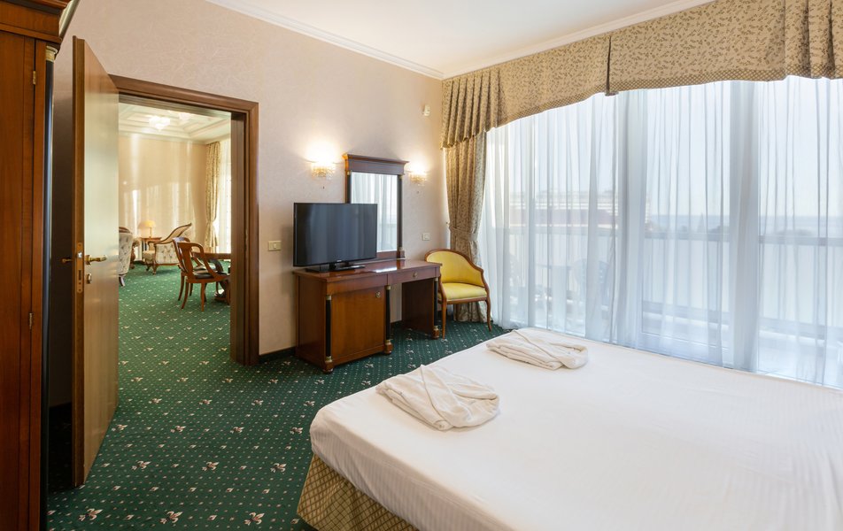 Оснащение номера: две комнаты: спальня и гостиная, двуспальная кровать, прикроватные тумбы, стол, стулья, мягкая мебель, телевизор, телефон, холодильник, мини-бар (платно), кондиционер, сейф, набор посуды, Wi-Fi в номерах