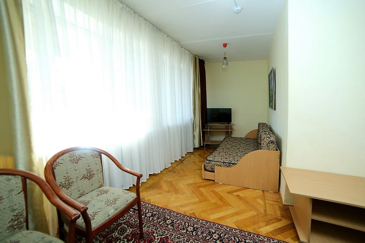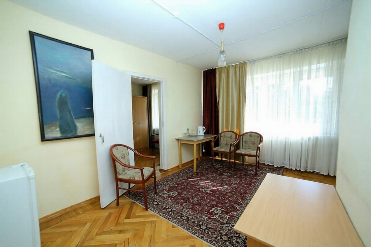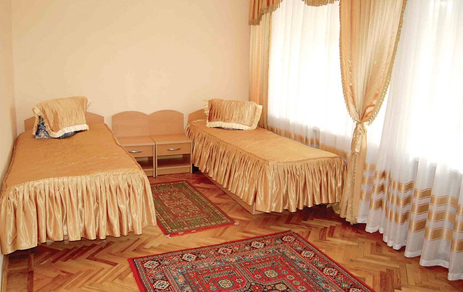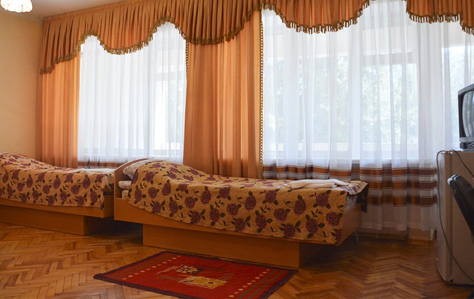 В номере: вешалка, зеркало, кровати односпальные, прикроватные тумбочки, стол, стул, шкаф, телевизор, холодильник, чайный набор посуды, электрочайник