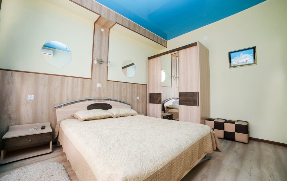Оборудование номера: спальня и гостиная, двуспальная кровать, прикроватные тумбы, стол, стулья, шкаф, мягкая мебель, журнальный столик, шкаф с посудой, телевизор, холодильник, чайник