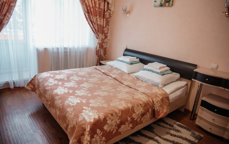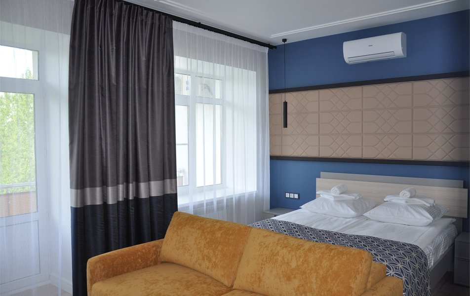Оснащение номера: вешалка, диван раскладной, зеркало, кровать двуспальная, прикроватные тумбочки, пуфик, стол, стулья, шкаф, кондиционер, телевизор, холодильник, чайный набор посуды, электрочайник
